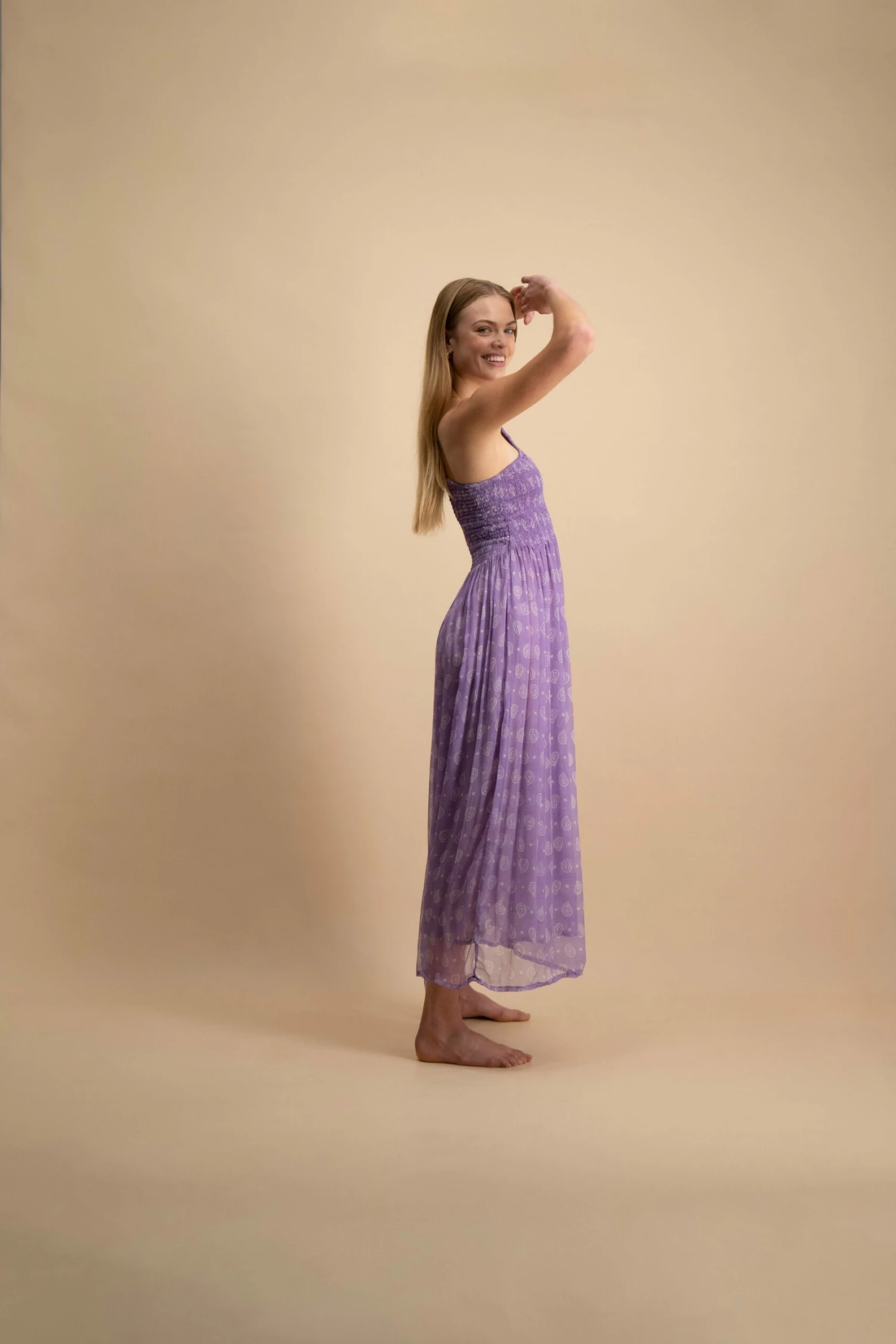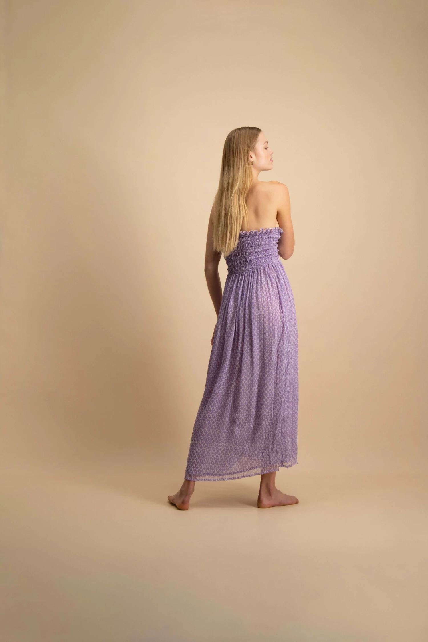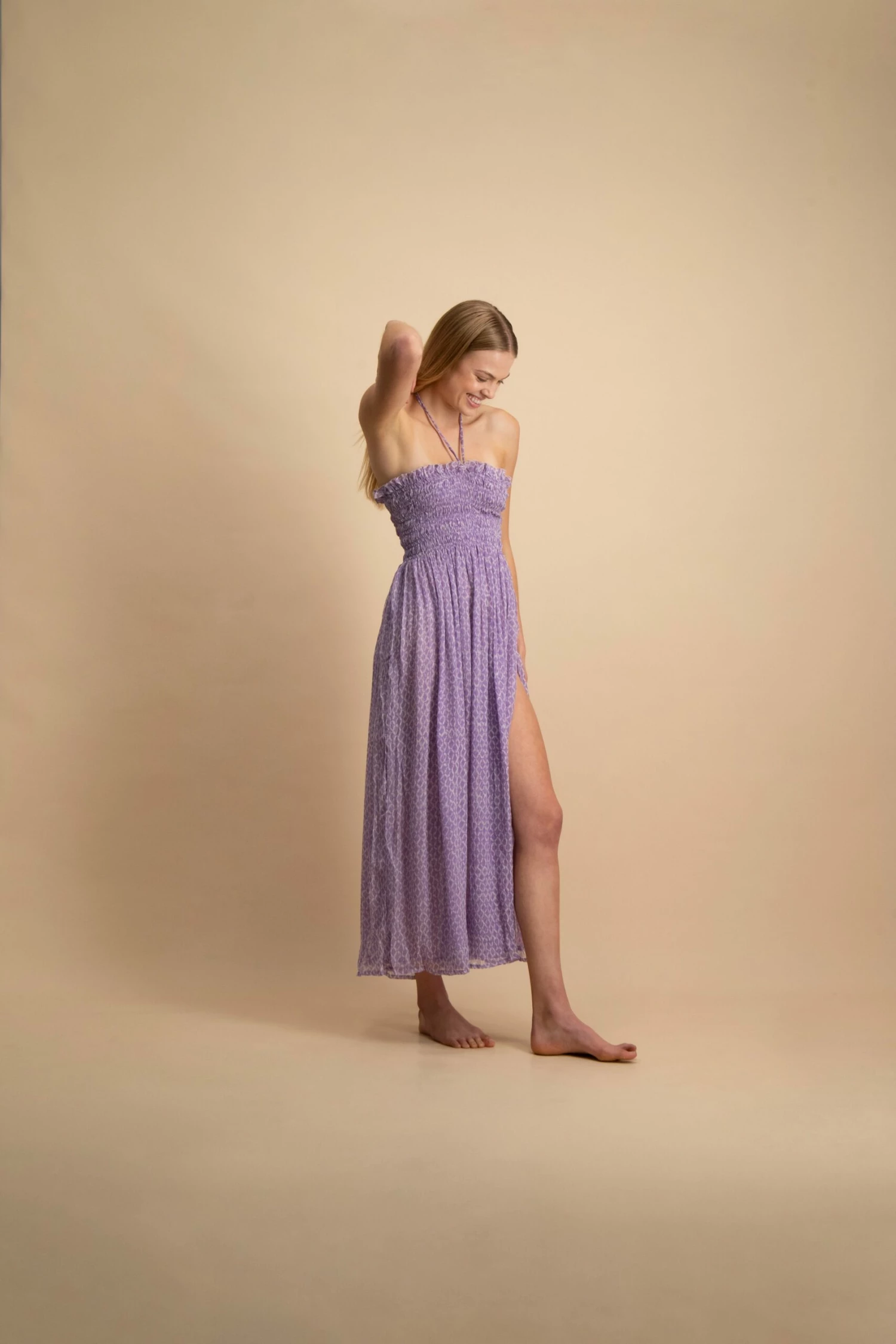 A real multi-wear piece: because versatility is everything. Can be styled any which way: as a midi dress or maxi skirt, with or without the delicate cord tied around the neck. Feminine and easy-wearing with a subtle knee-high split and stretch-smocked bodice, finished with a pretty frill. Perfect for an off-duty look.