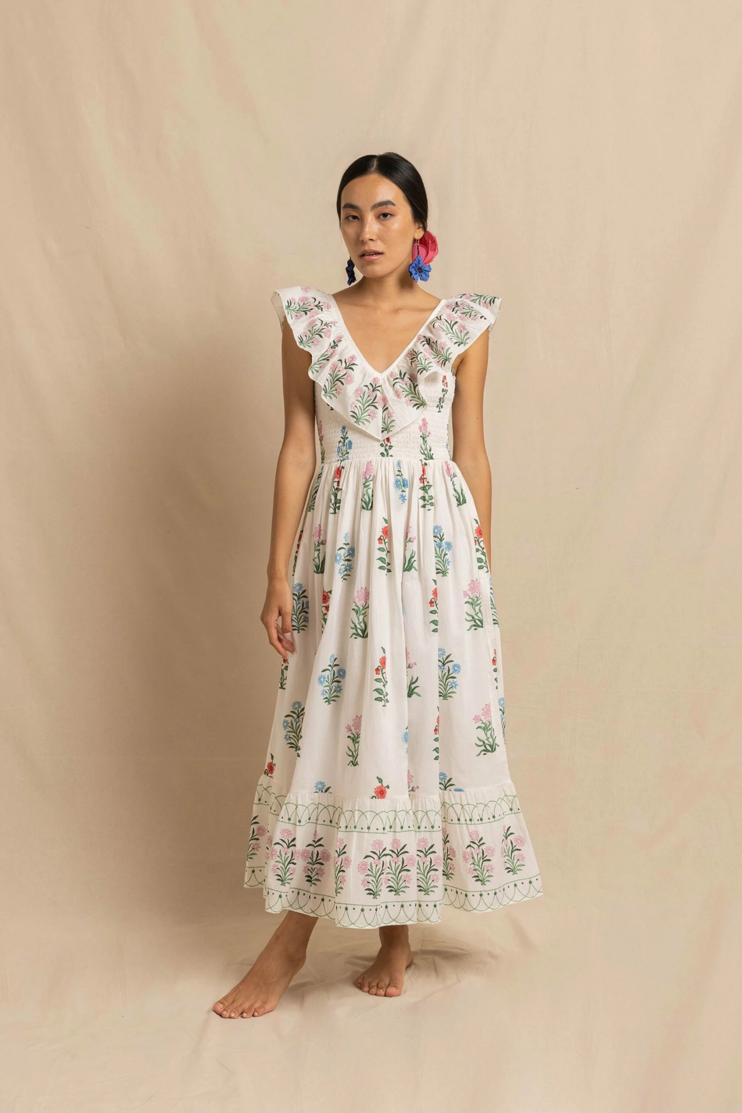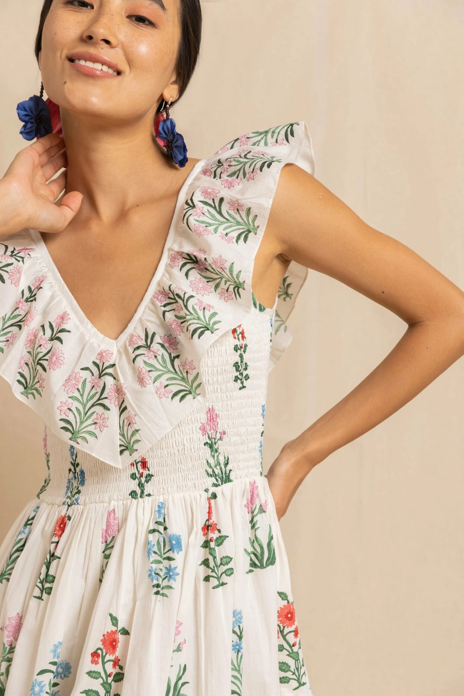 Introducing Birdie! A sun dress with a smocked bodice and longer skirt. Set off by a gorgeous frill around the neckline, front and back, Birdie is expertly hand-block printed in our new Jodphur flower design.