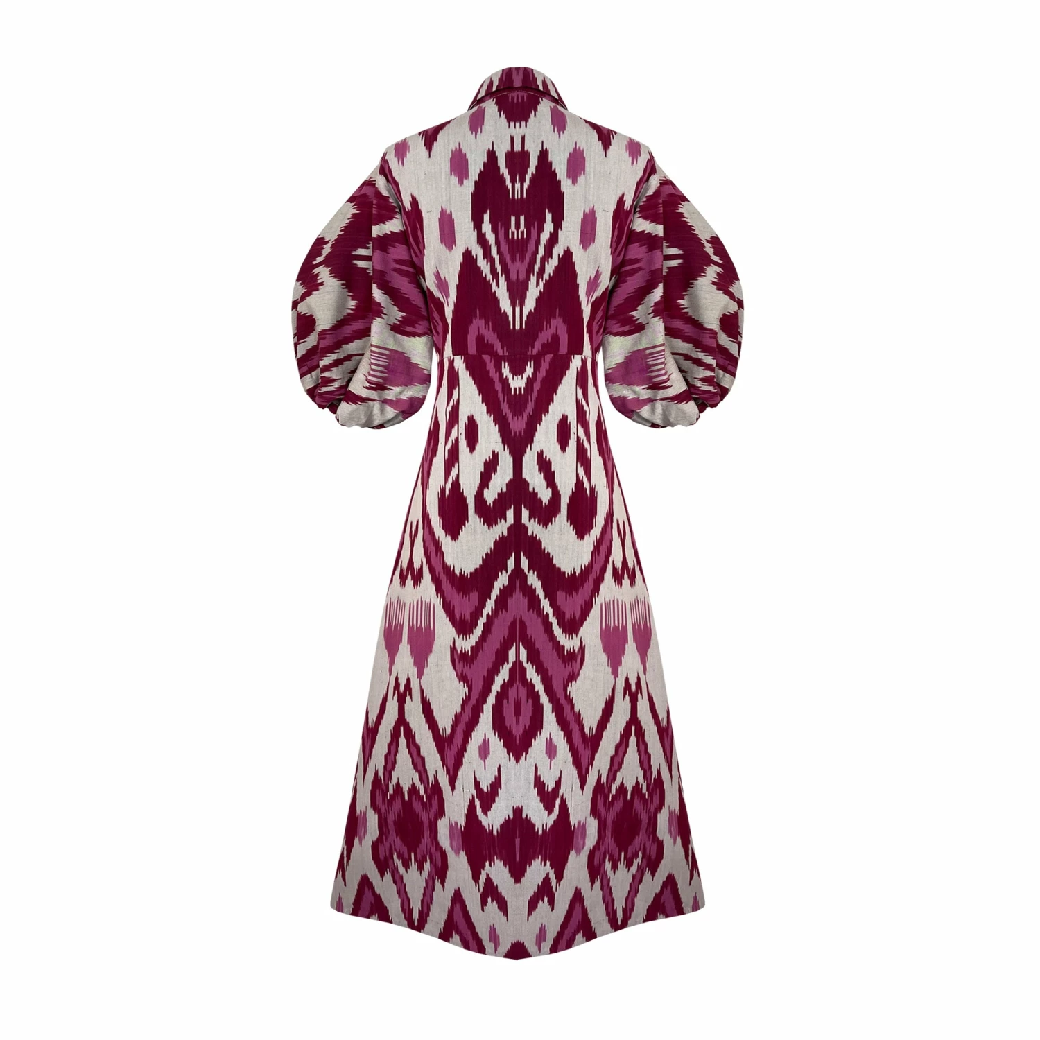 This new version of the Jodhpur dress it is made out of beige, pink and burgundy handwoven silk Ikat. It features fitted body, collared neckline and ballon sleeves.
