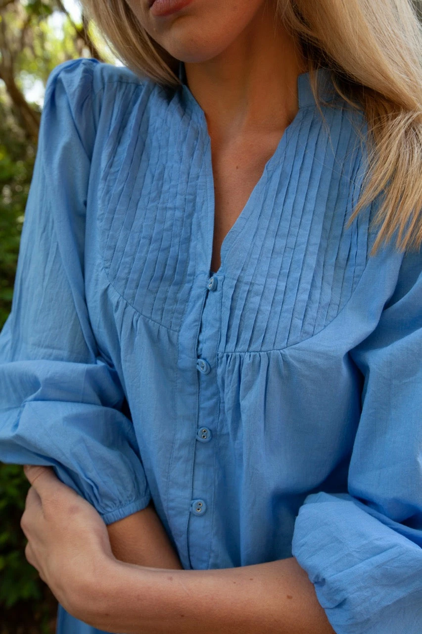 Make a statement in the Caitlyn Dress. Features include pleated detailing on the chest and covered buttons leading down to the skirt. It also features an elastic cuff on the sleeve and a flowy, light and airy cotton fabric for effortless style.