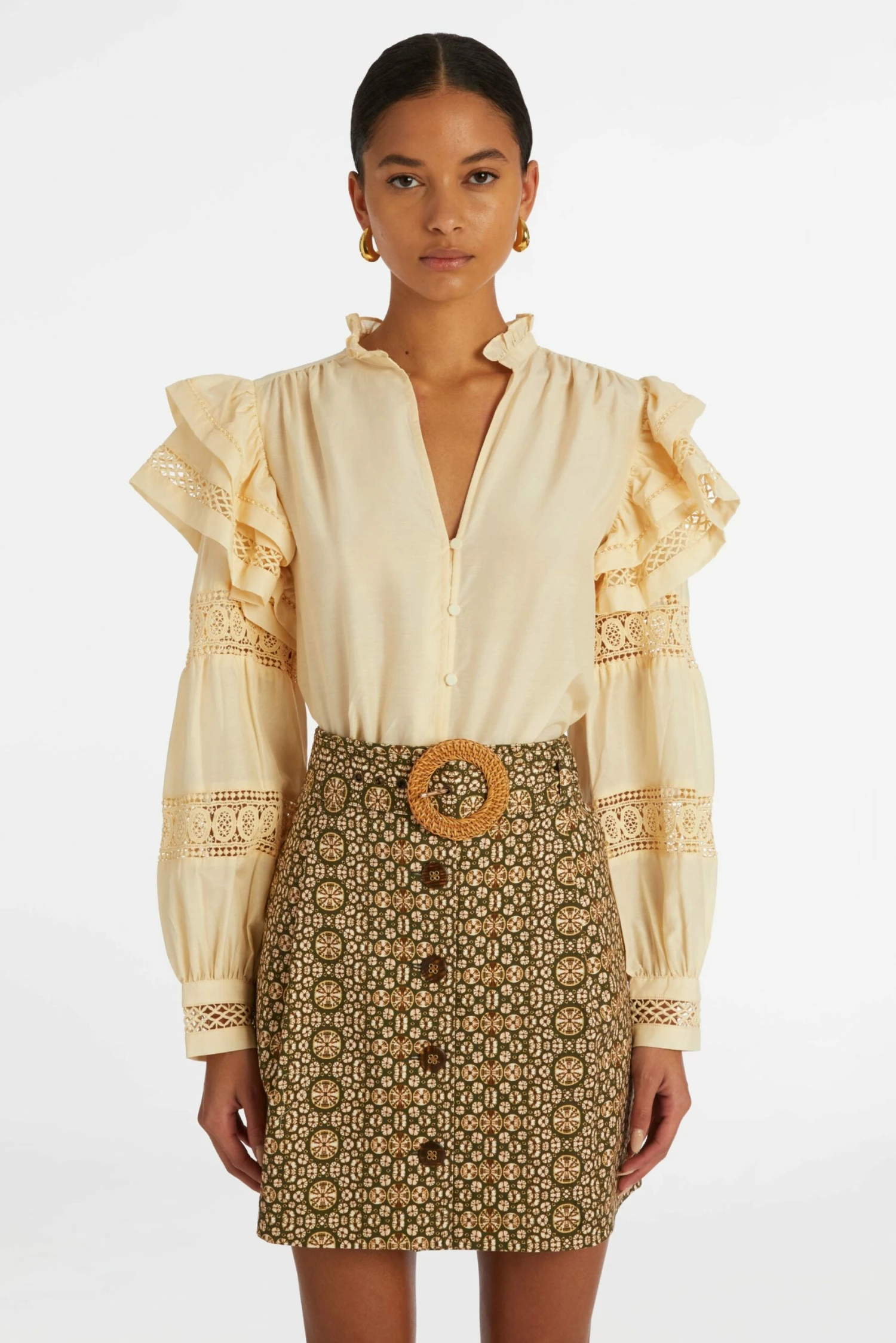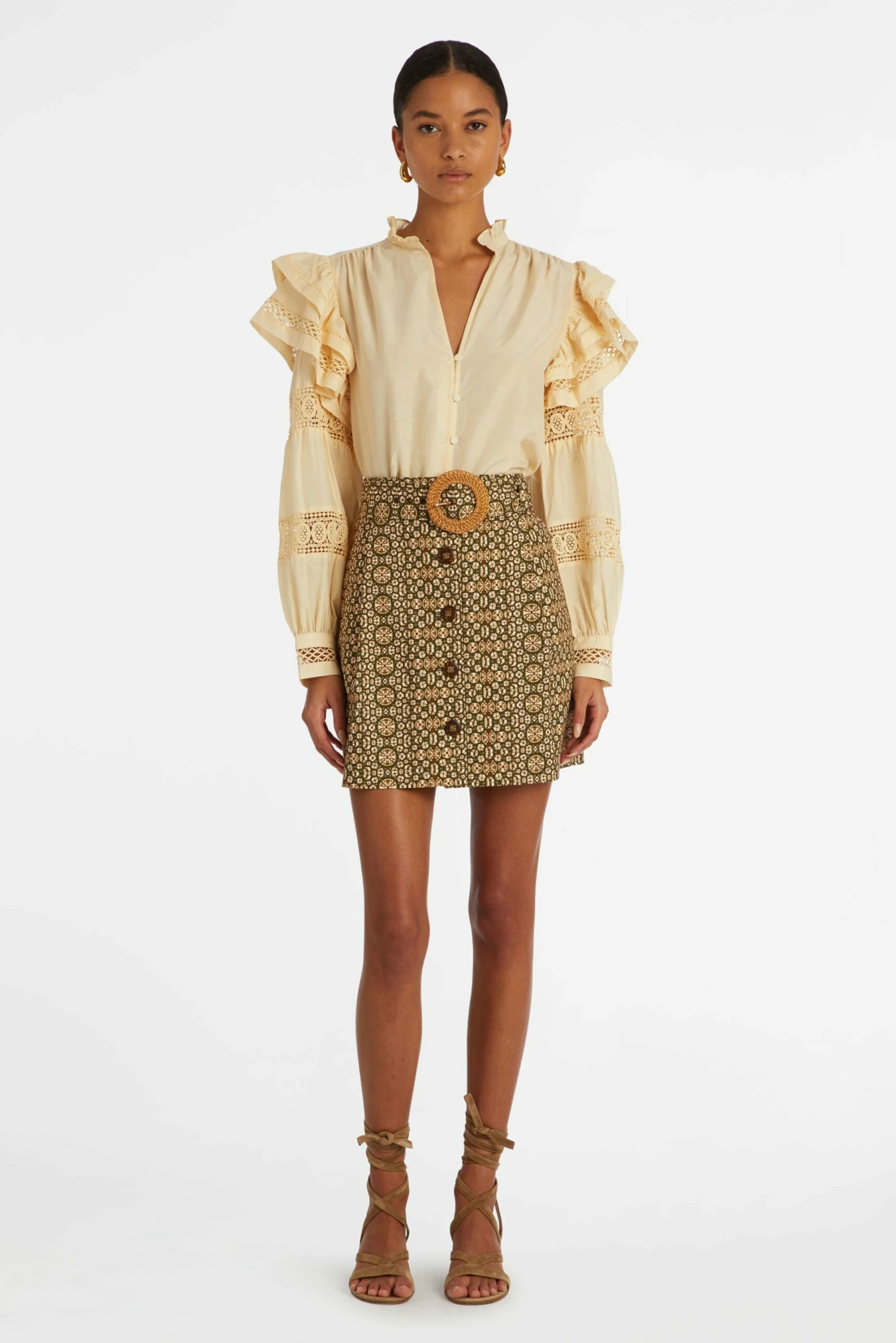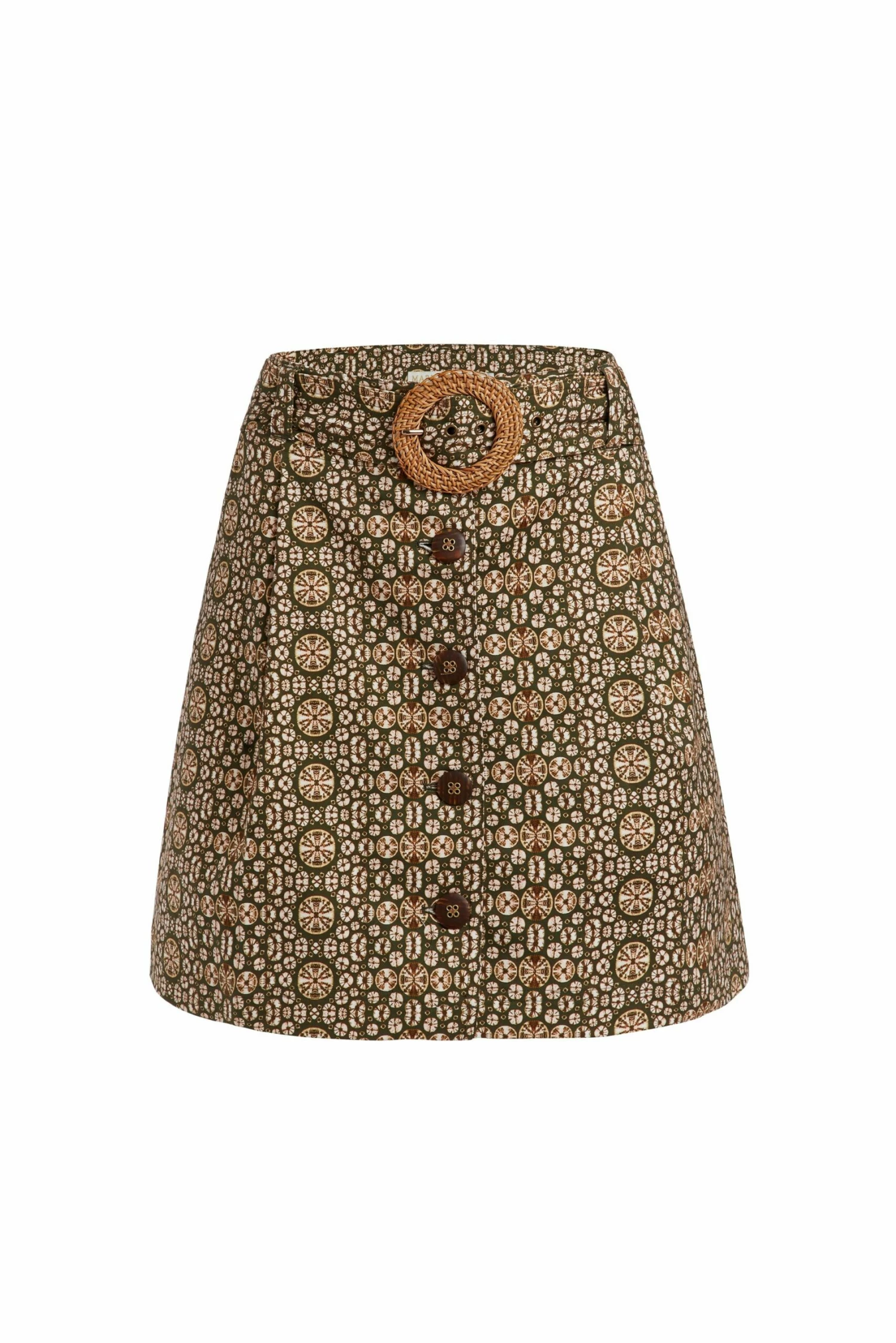 Maire Oliver takes on the mini skirt with Carla. A new silhouette for the season, Carla’s high waist and clean lines feel both retro and modern. Nature-inspired elements, including tortoiseshell buttons, a rattan buckle, and an earthy Olive Shibori print, and texture to the trans-seasonal look. Pictured here with our long-sleeve Talia Blouse in Dune.