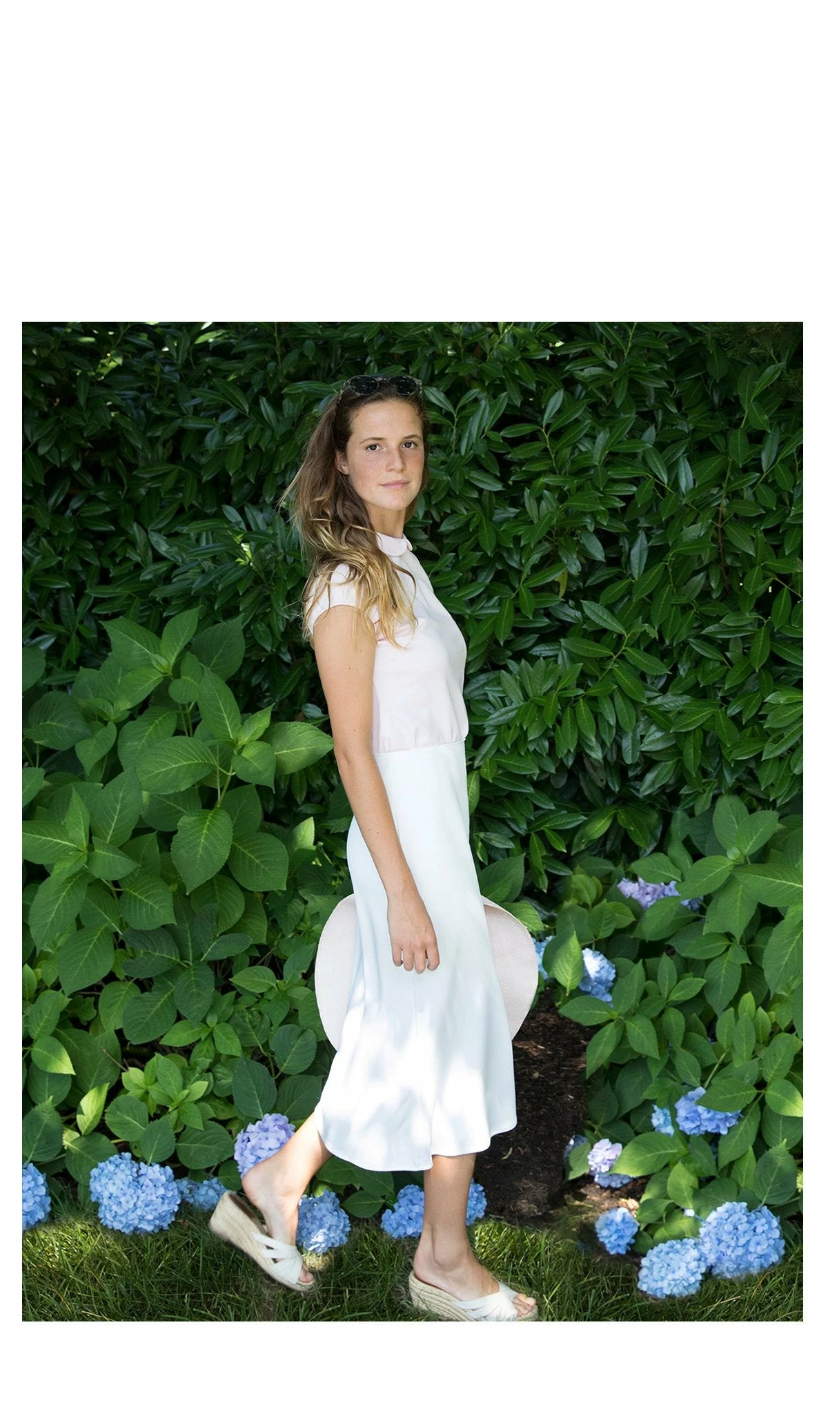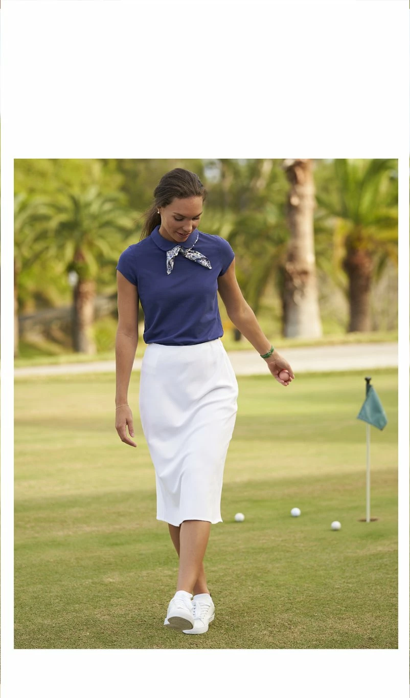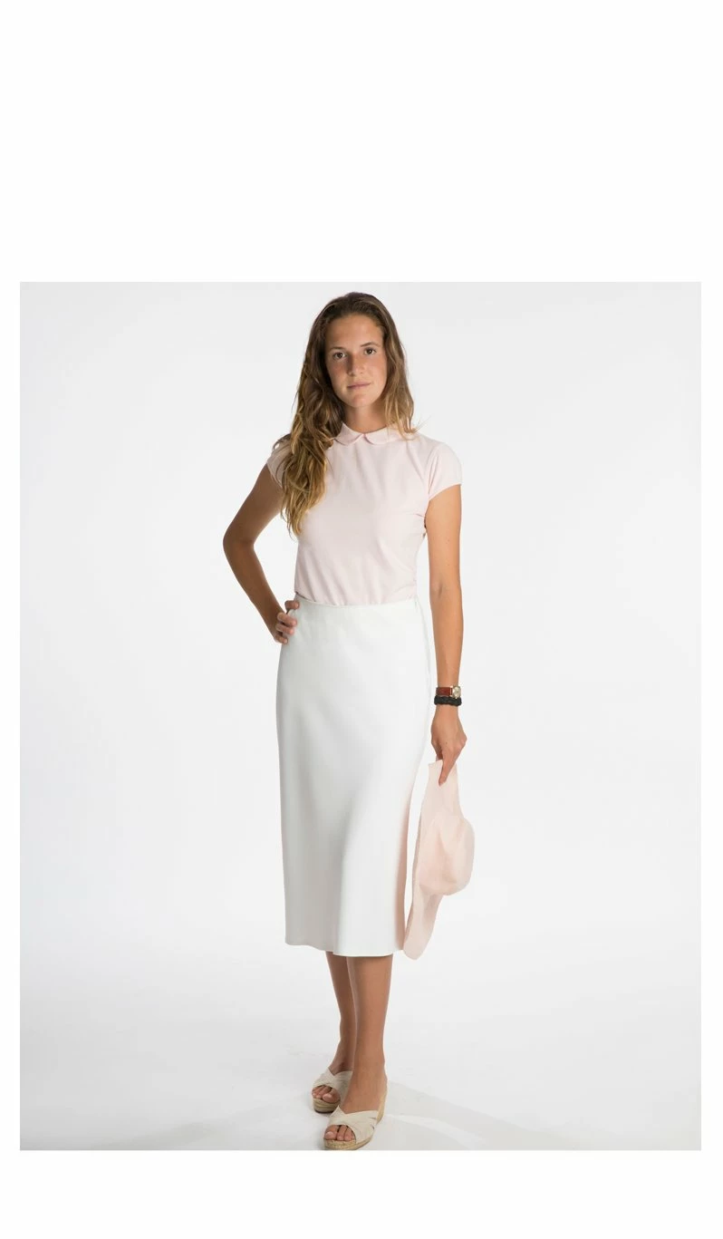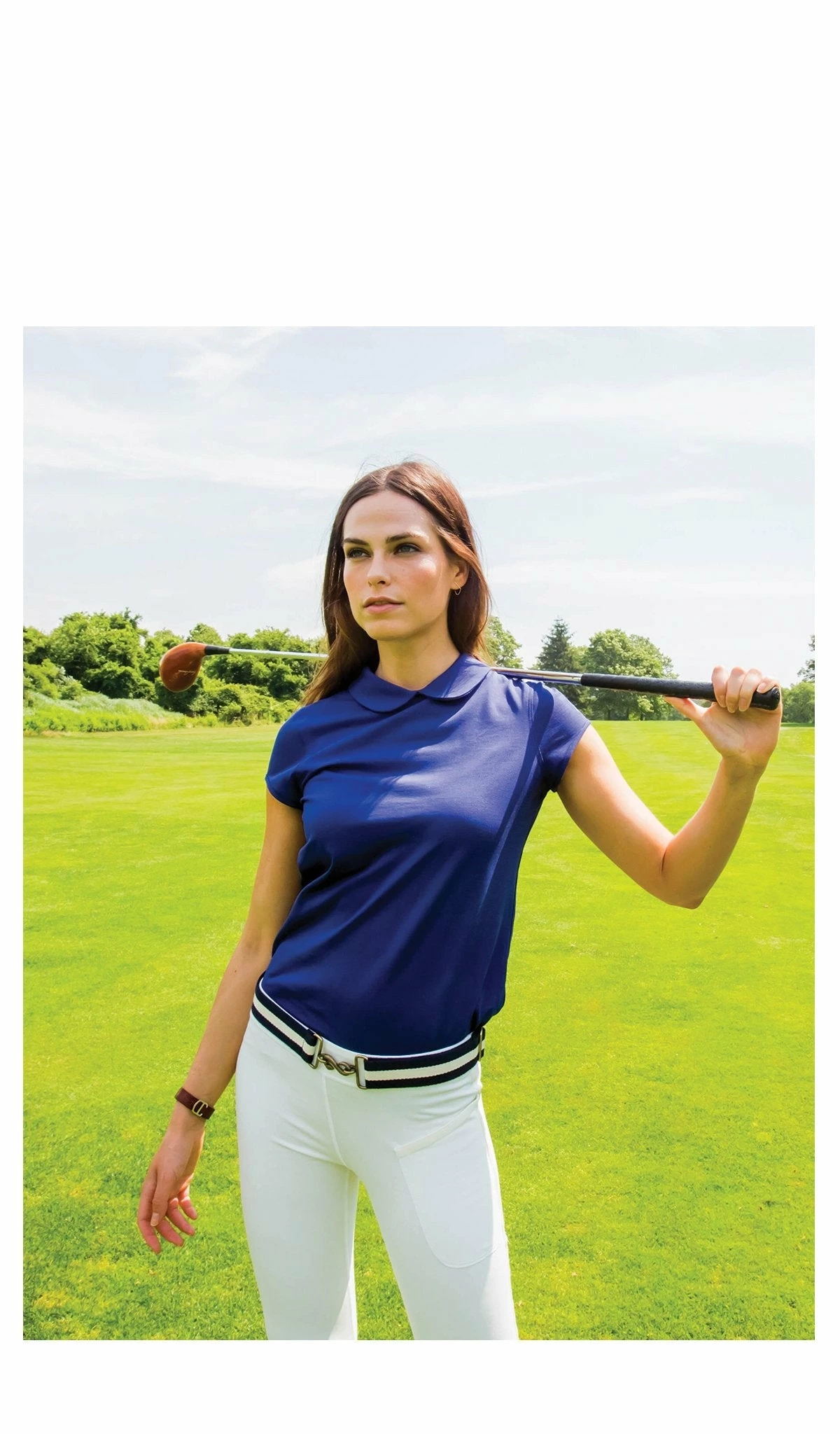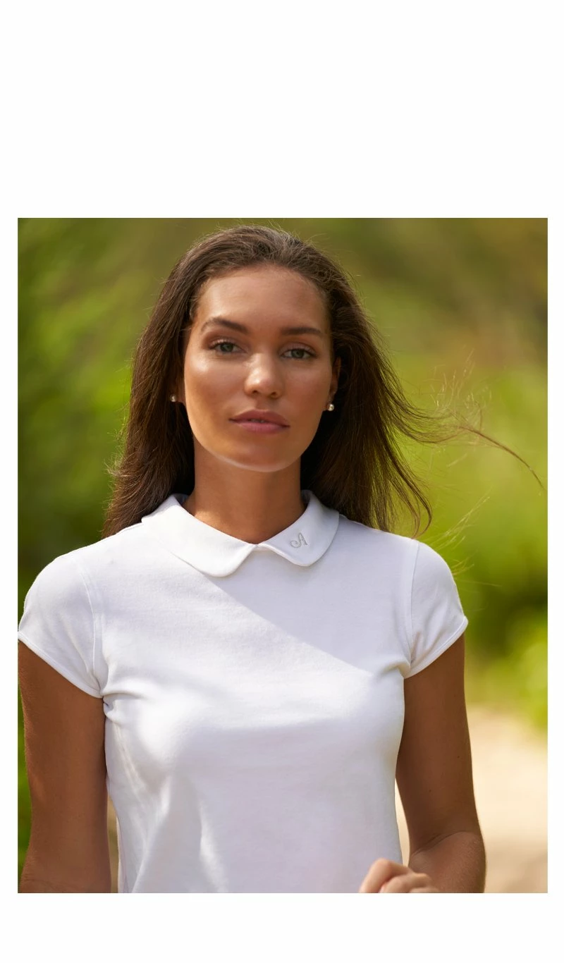 This is our version of the golf polo. It is feminine with a cap sleeve and peter pan collar with three delicate buttons at the back of the neck. It’s flattering, so soft and elegant. Perfect for a day on the course or lunch on the Left Bank or for looking chic on the courts.