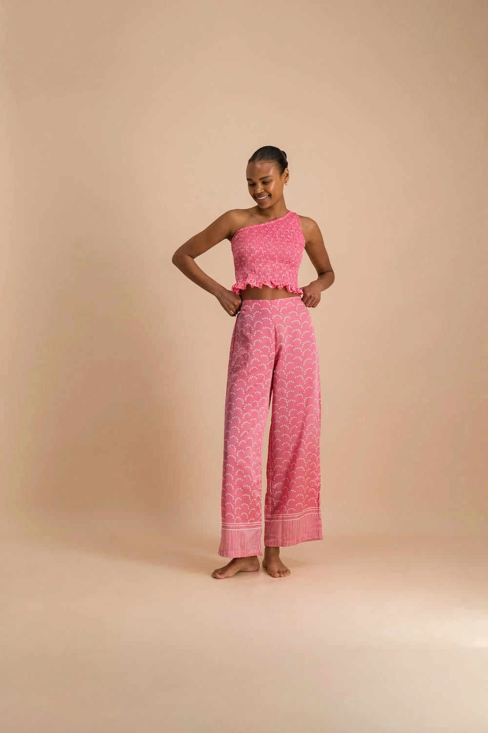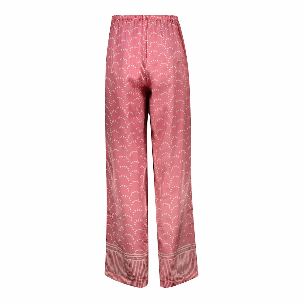 All hail the silk palazzo pant: a resolutely chic way to let your legs do the talking. This is a new style with timeless appeal, perfect to dress up or down. Breezy and wide legged, these sit mid-rise on the waist with an elastic back panel for ease of wear, with miniature mother of pearl button detailing on one side. The hem is trimmed with a contrasting print in the same hue, enhancing a bohemian feel.