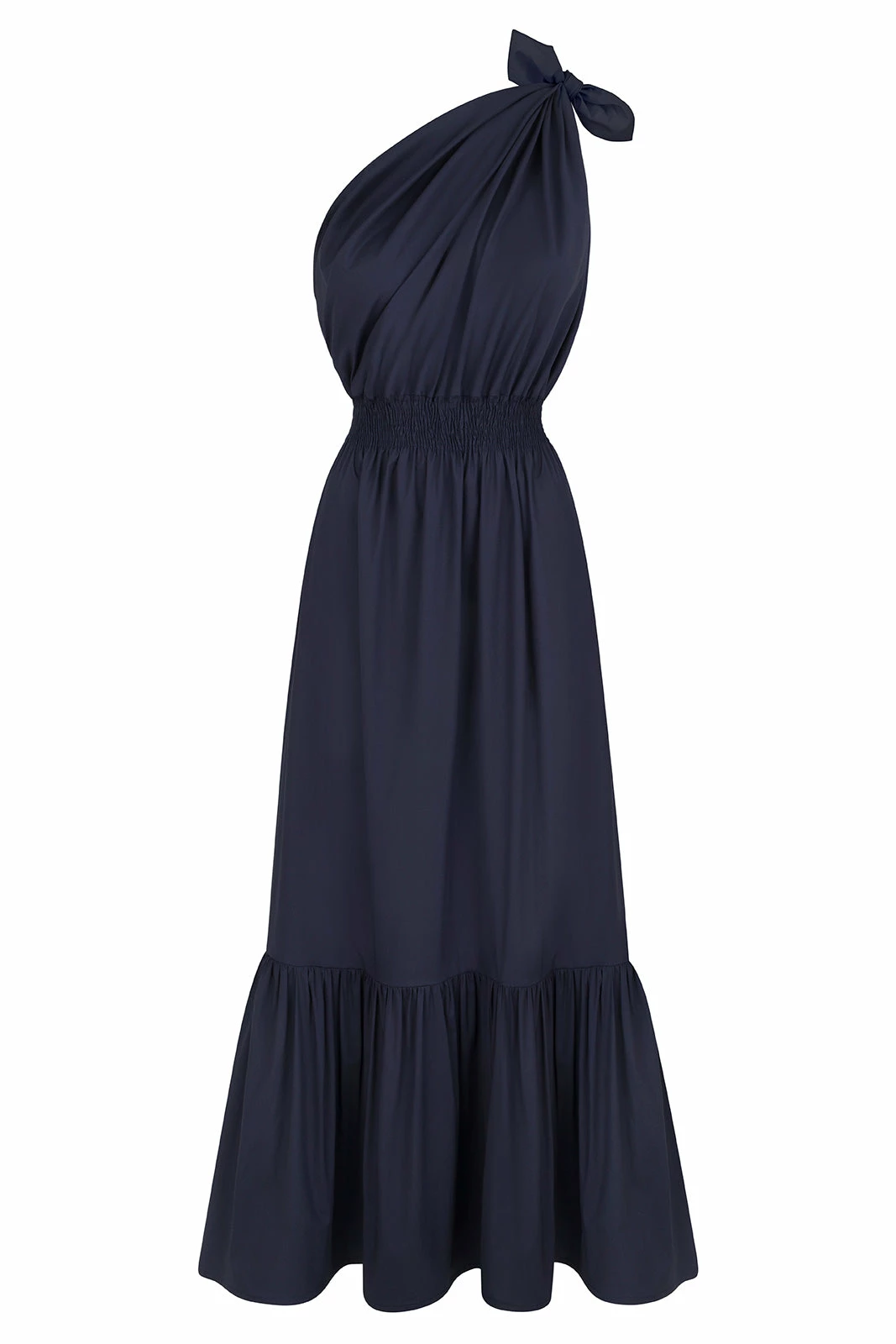 Made from our best quality cotton, Demi is a delicate maxi-dress with an asymmetrical halter neck and a stylish cut. A high elasticated waistband creates the classic A-line silhouette, ruffling the fabric up across the bust and down towards the feet. The style is finished with a charming bow detail on the left shoulder.
