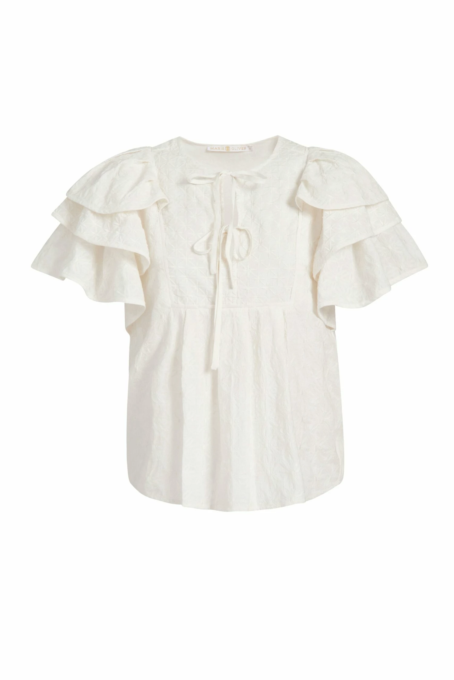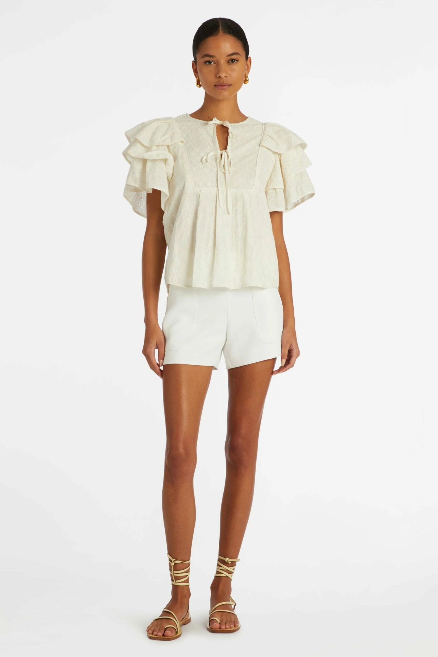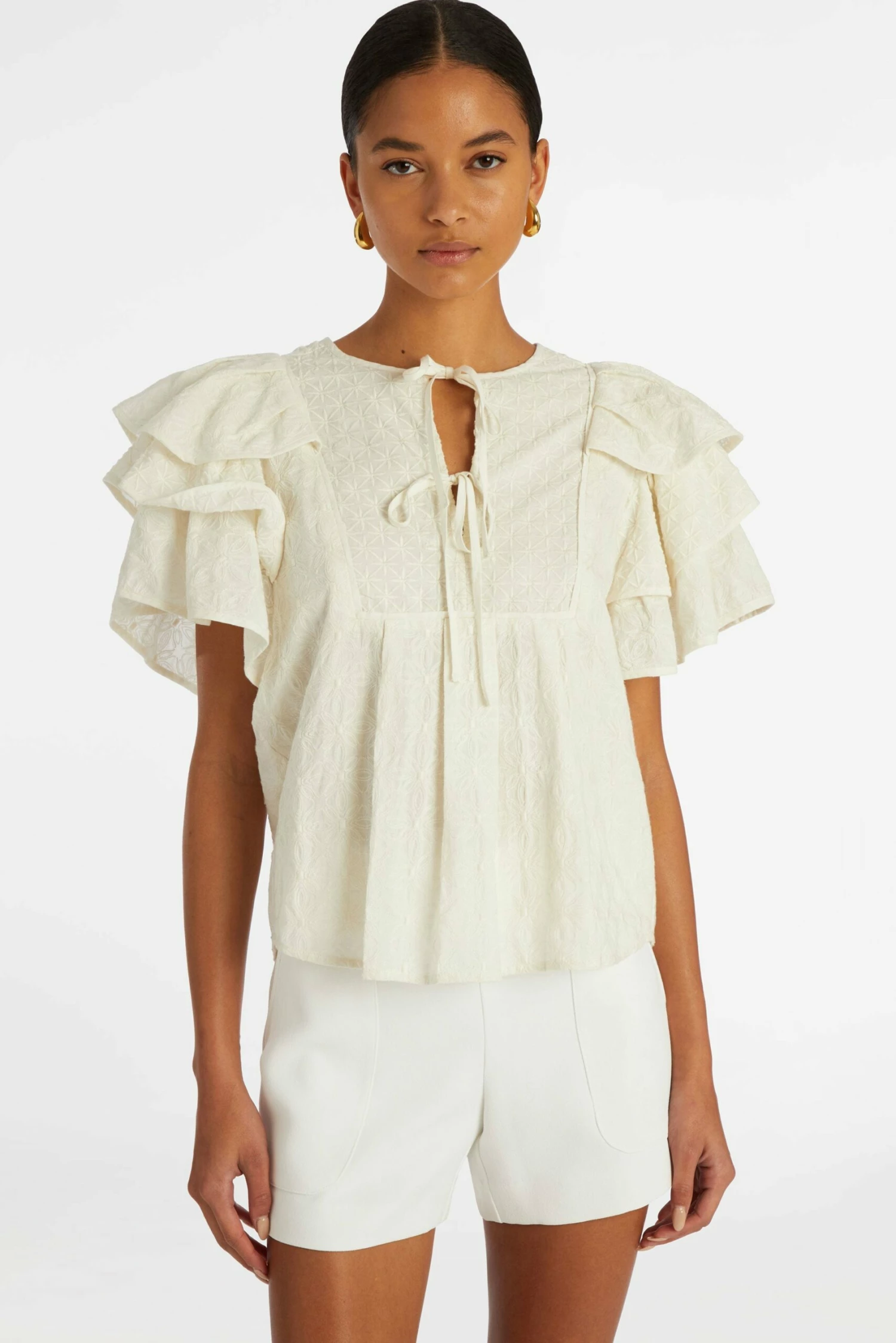 Bold and timeless with wide ruffle sleeves and a pleated big, Demming takes everything we love about our popular Reese Top and reimagines it as part of our new embroidery delivery, which adds beautiful geometric and floral stitching for a buy-now/wear-now look that takes you from end of summer backyard fetes to fall lunch dates.