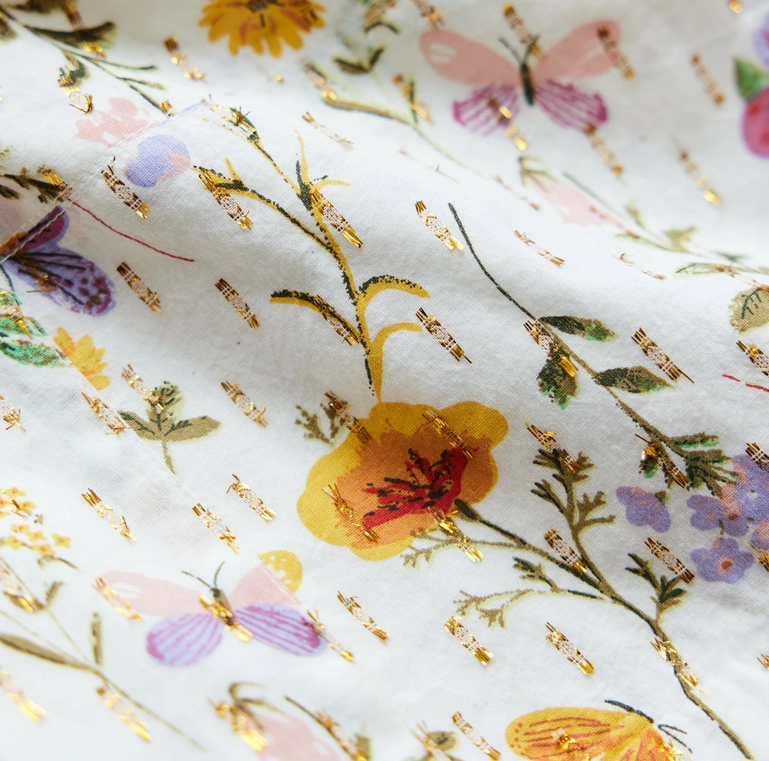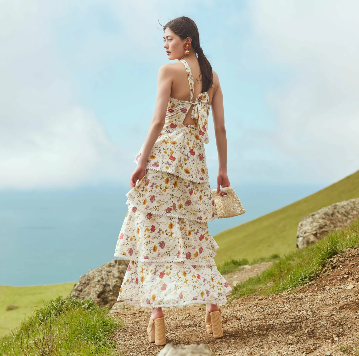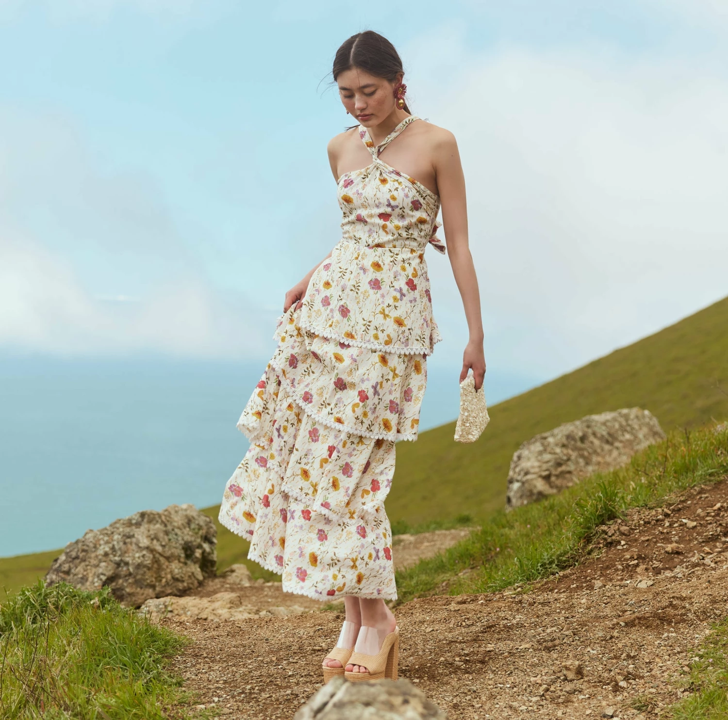 The Emma is a floral printed maxi dress with cross-tie details at the neck to the back using twin keyholes. It can be tied in multiple ways such as straight down or criss-crossed in back, and number of twists at neck can be customized for maximum comfort. The high-waisted skirt of the Emma is based on our best-selling tiered style Brenda, with lots of flounce to dance the night away. Tonal alabaster crocheted lace adorns the edges of each tier for a delicate detailed finish. To add to the whimsy, this dress has touches of intricately woven gold lurex that add sparkle, glistening in the sunlight