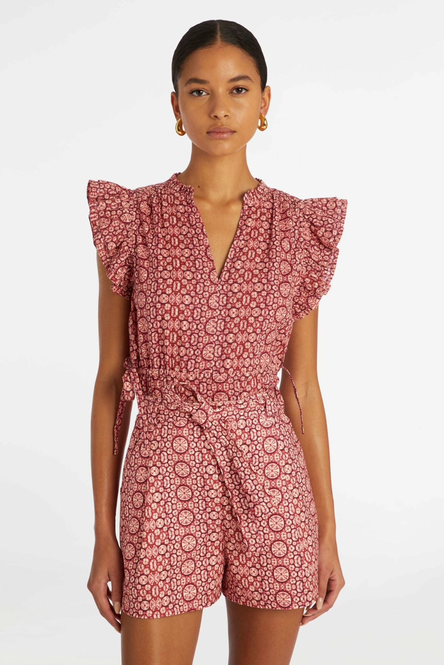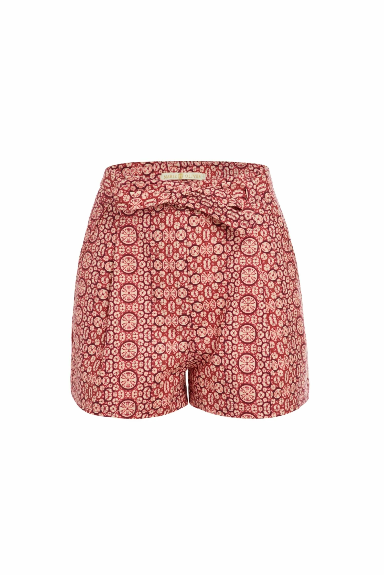 Designed to sit at your natural waist, giving you a nice defined shape, our Eryn Short features a removable tie belt. She is pictured in our Hibiscus Shibori print—a punchy stamped motif in an inky blend of berry reds and pale pinks—and wows as a set when combined with our matching Olive Top.