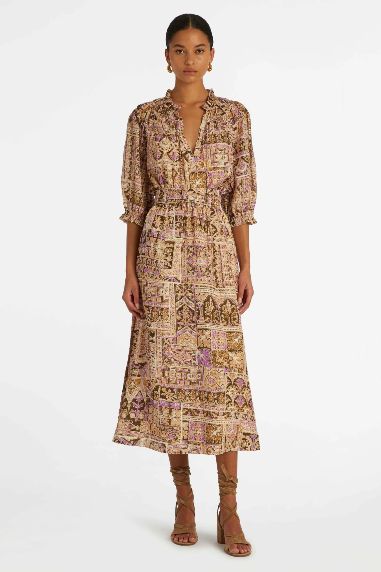 Straighter through the body for a more streamlined look than similar Marie Oliver silhouettes, Estine is a paneled wrap skirt that gently follows the lines of the body before subtly fanning out around mid-calf. The adjustable tie waist can be worn knotted or looped into a bow. Estine is pictured here in our Amethyst Tile print, and she looks particularly smart paired with our Rory Top in Macadamia or Juniper. But you can go for a bolder look and make her a matching set when paired with our Amethyst Tile Finley top.