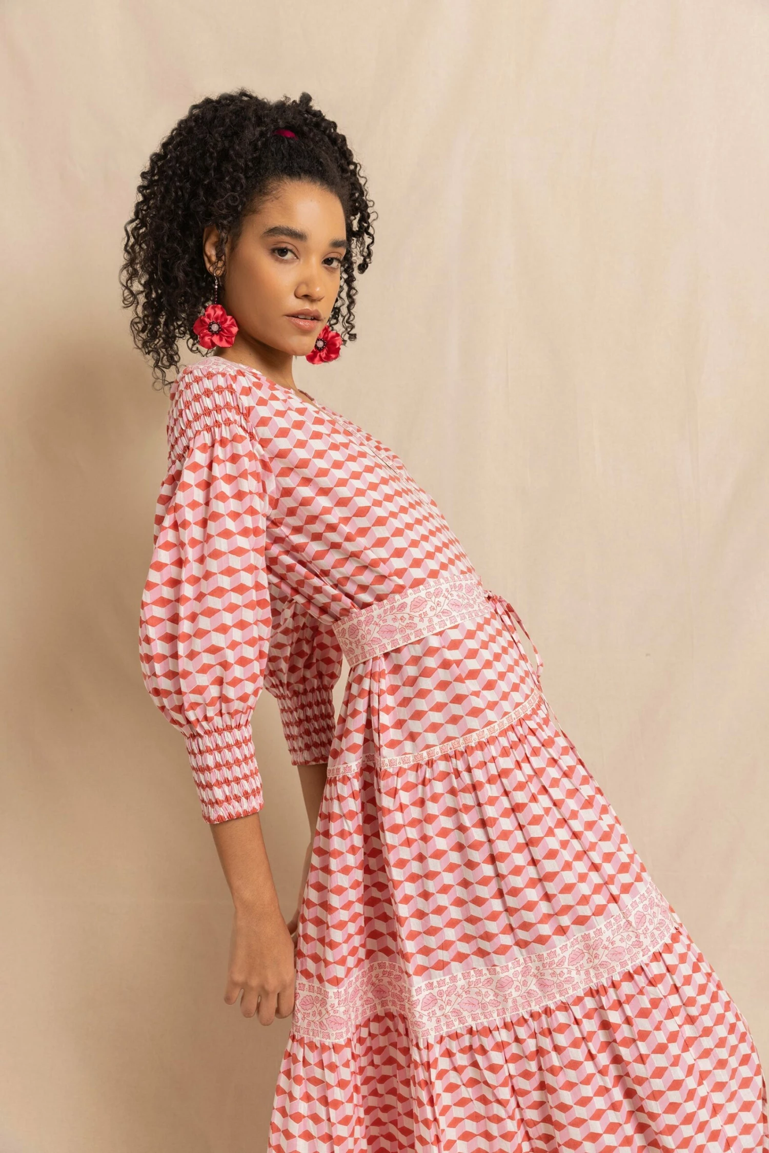 Our new Eve dress is pure summer comfort and elegance. Hand-block printed in our graphic Falling Blocks print, with delicate floral borders and matching belt.