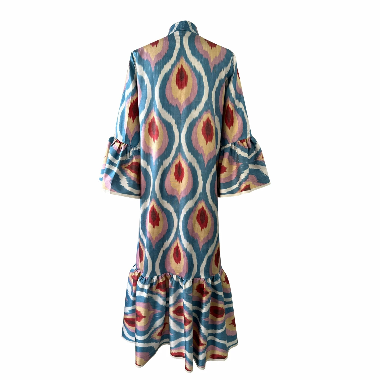 This tunic dress is inspired by traditional Chinese outfits. It is made of Uzbek silk Ikat, and it features Chinese knot buttons in the front.
