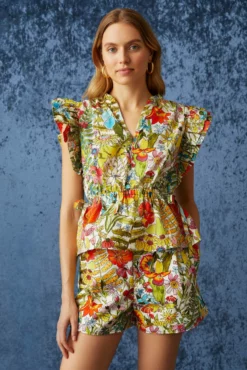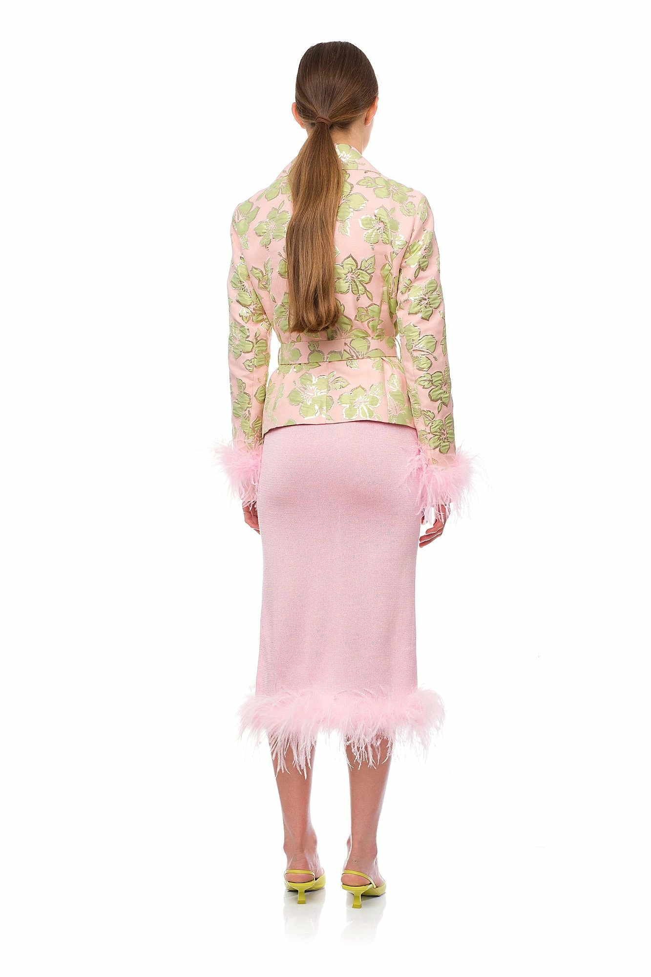 Signature jacquard pink jacket has belted waist, decorated with detachable feathers cuffs and an epaulette detail. Flower print creates perfect look with jeans, dress, skirt and perfect for a day or night.