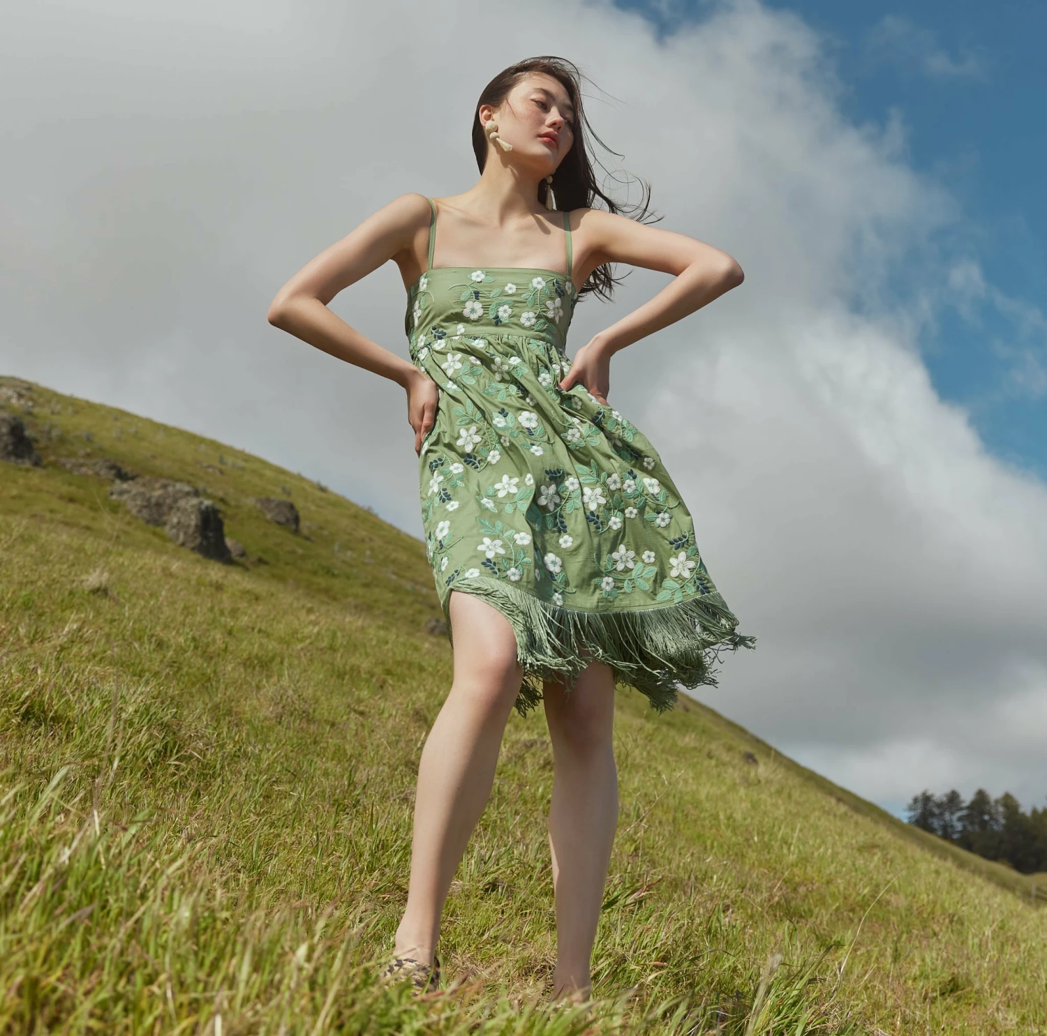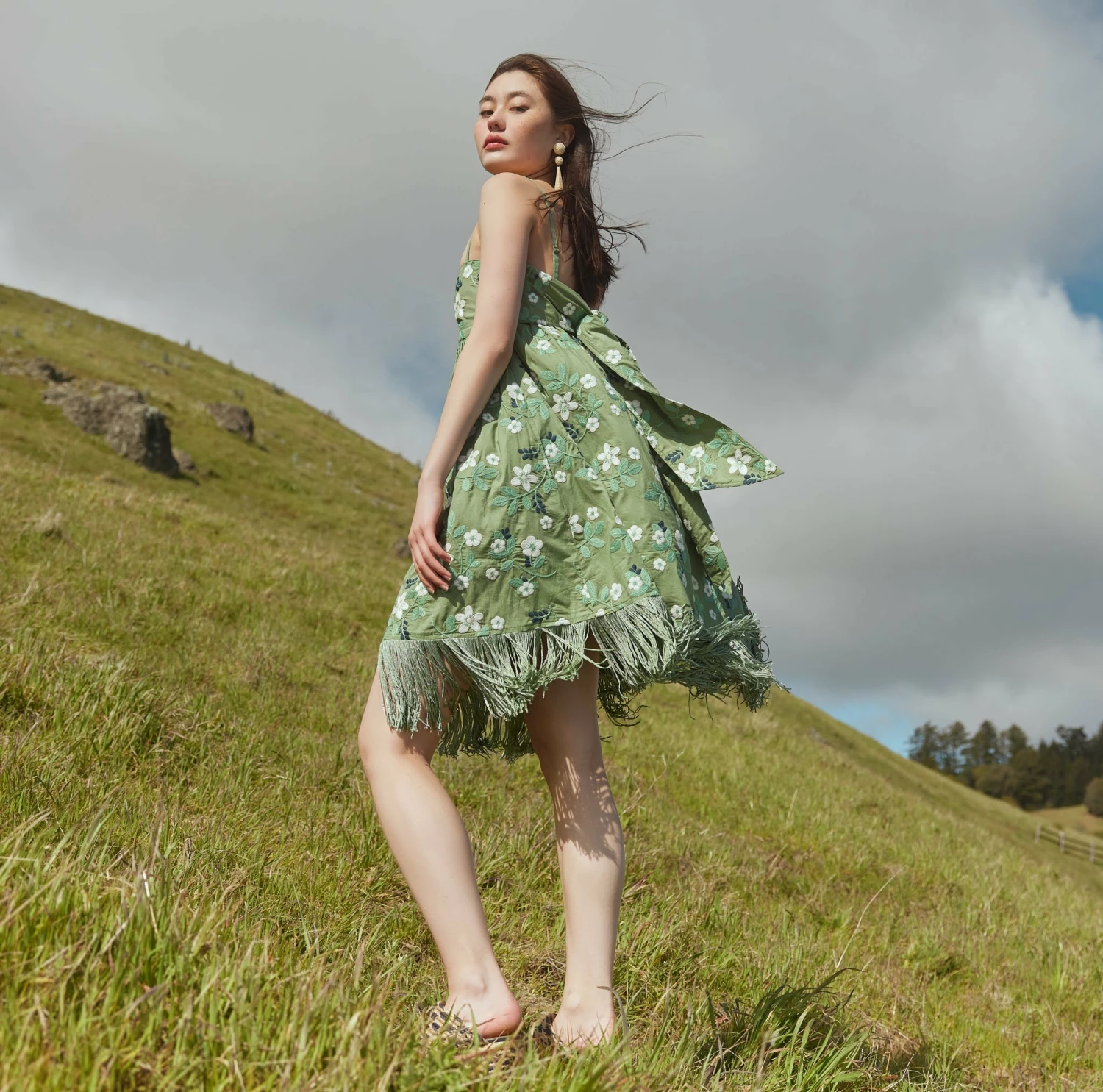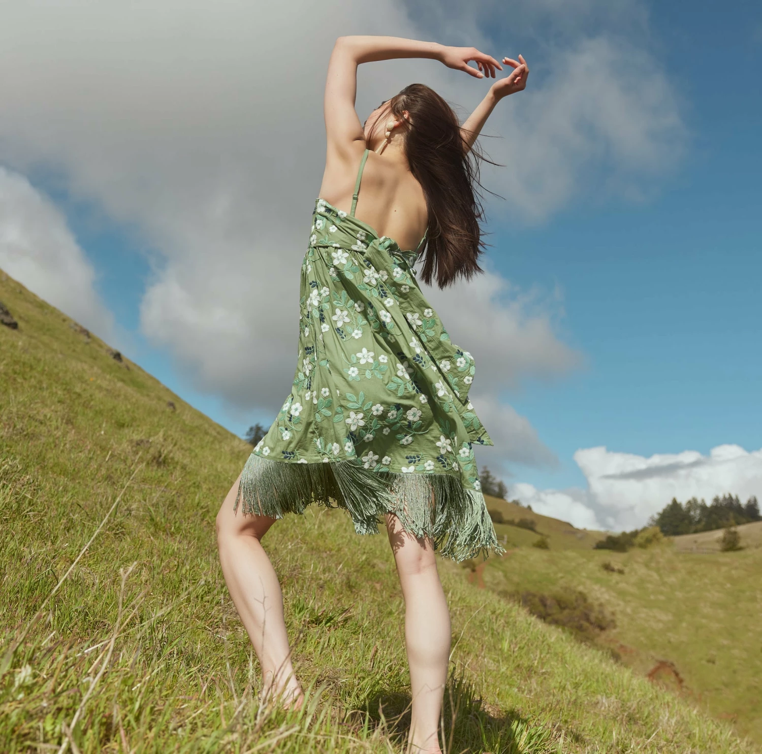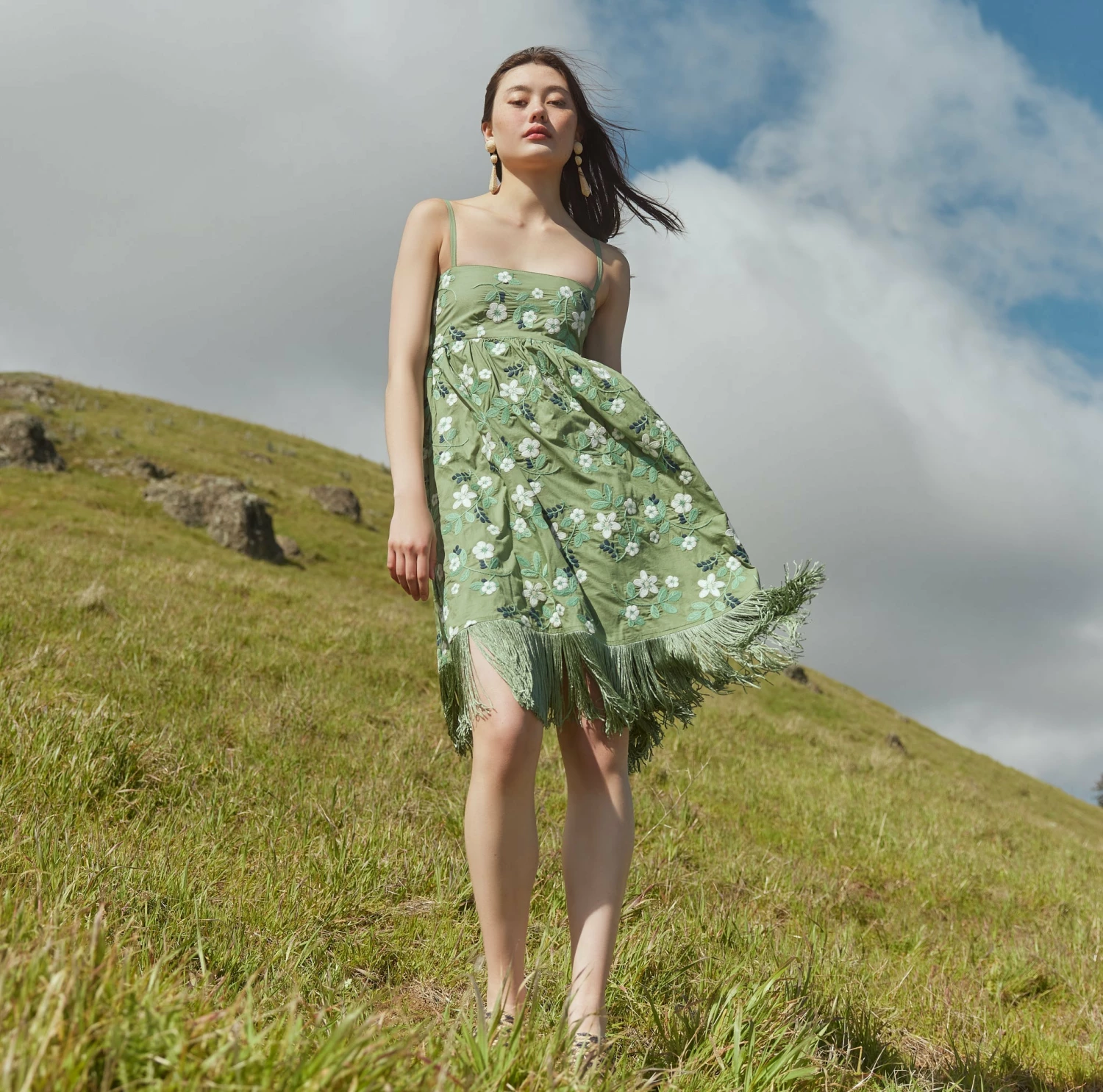The mini version of our best-selling midi, the Gavin is a fun & flirty dress with tonal fringe at the hem. Allover multicolored floral embroidery makes this piece eye-catching and special. The full, flowing skirt and empire waist flatter the silhouette, while allowing you to twirl and dance with ease