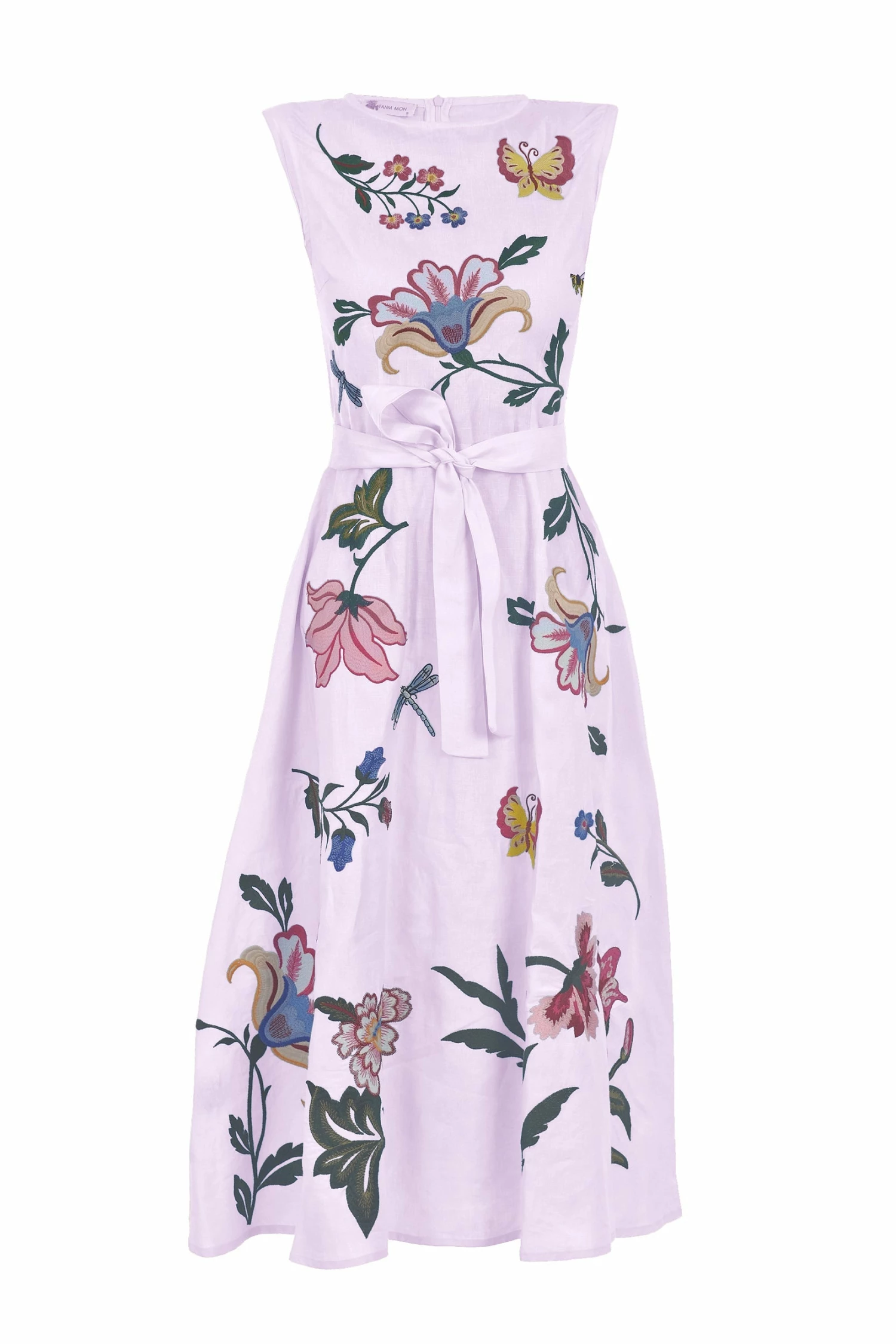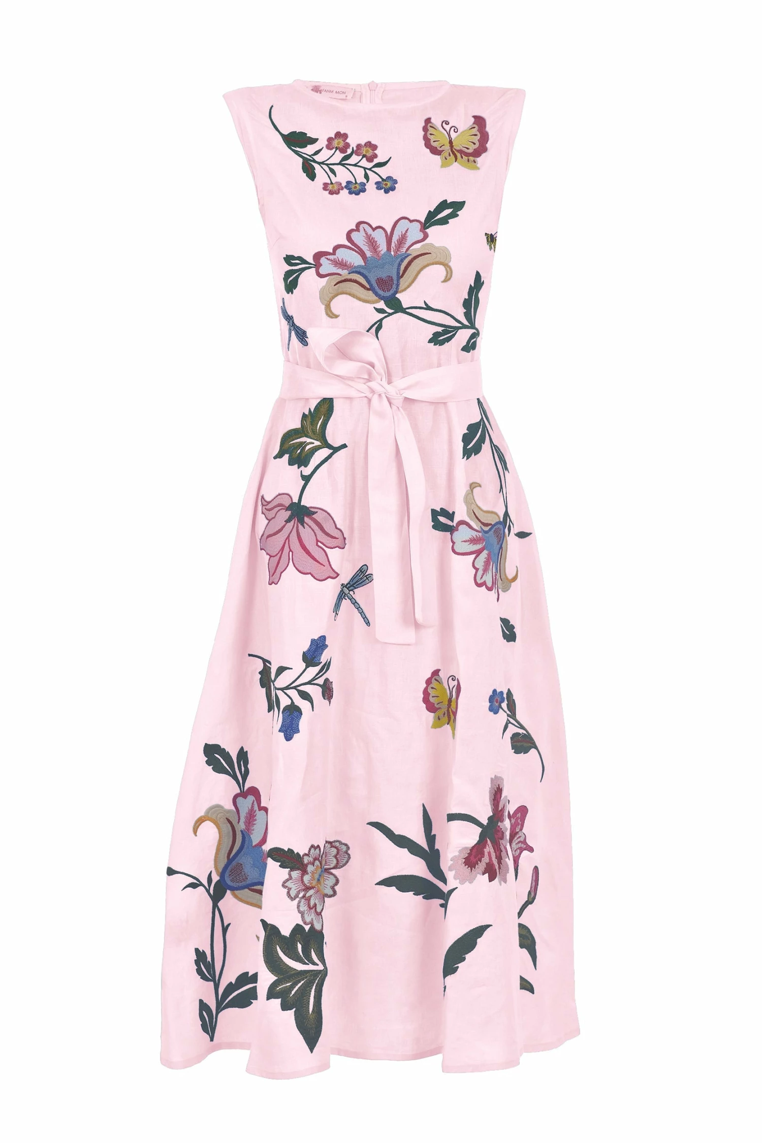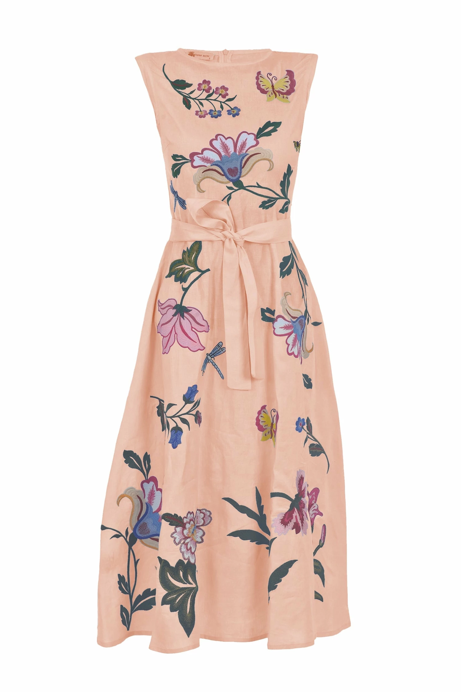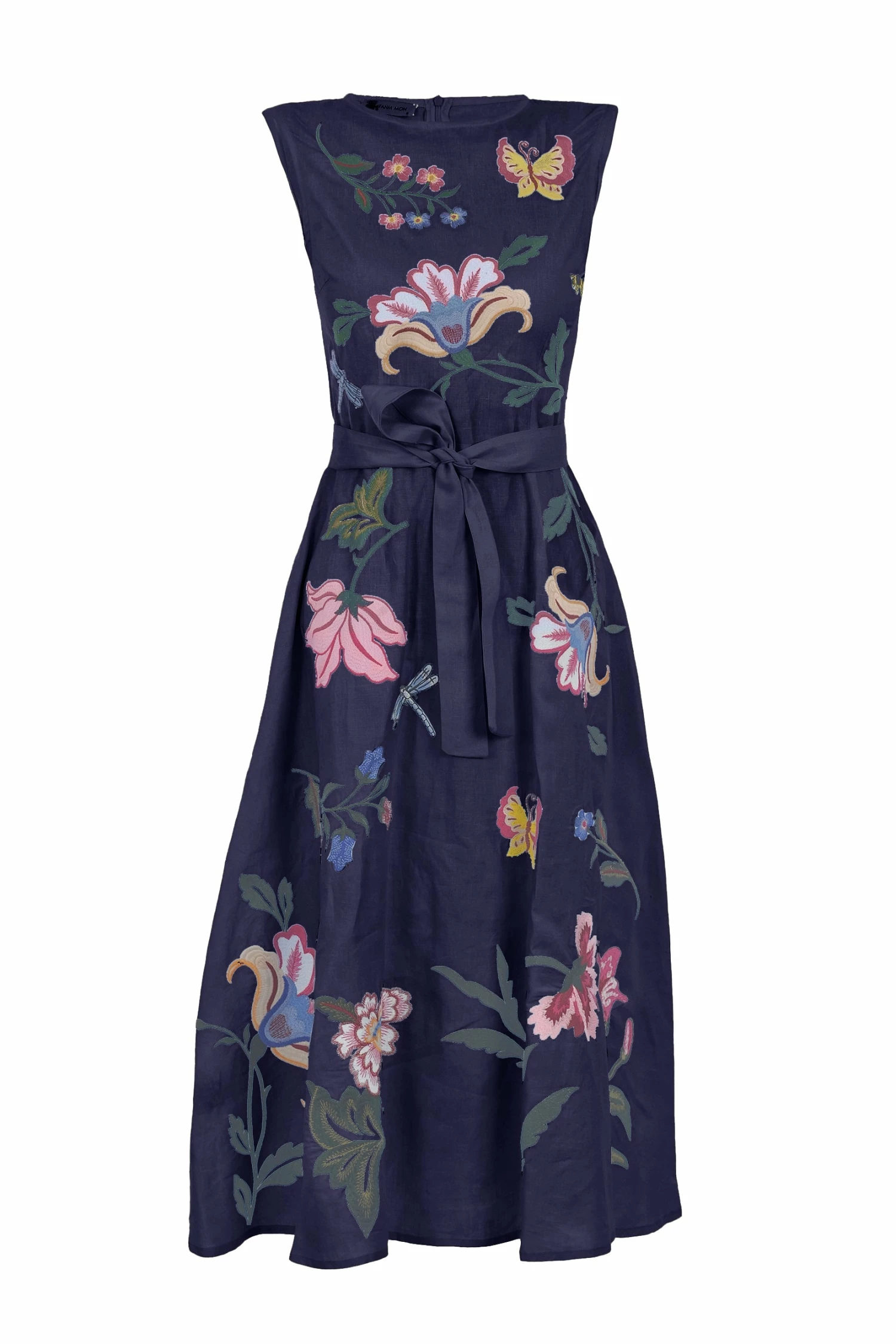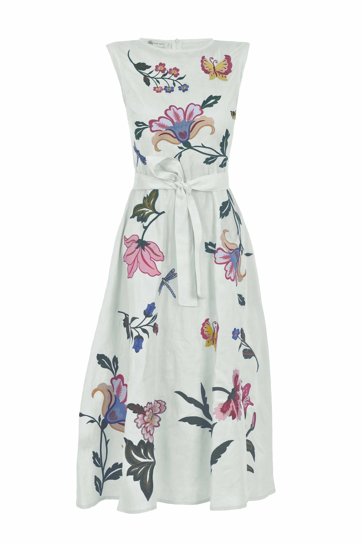 Linen Sleeveless A Line Dress with Floral Embroidery