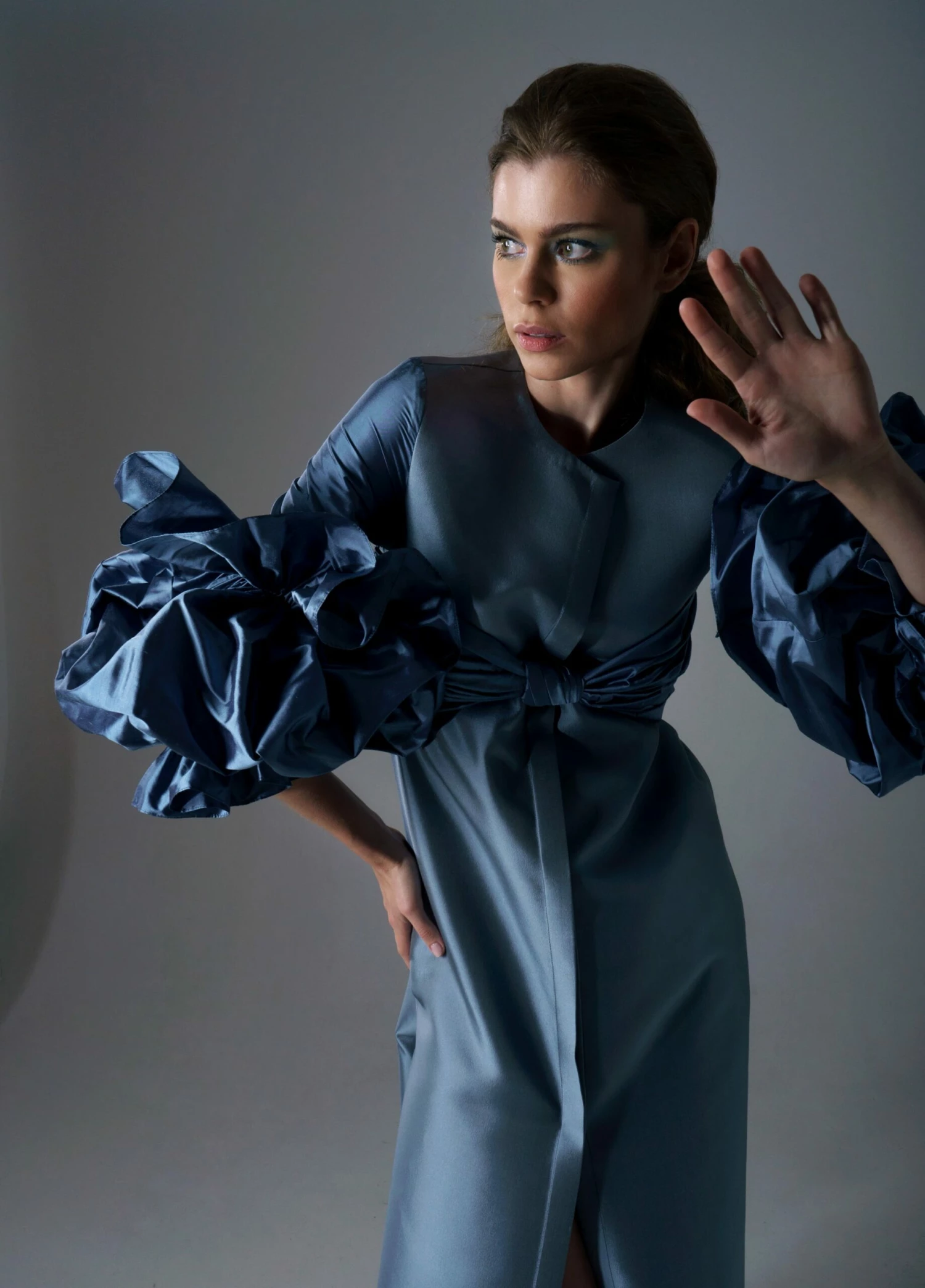 The elevated Isola dress will create a perfect elegant look with the stone blue color featuring a perfect midi length.