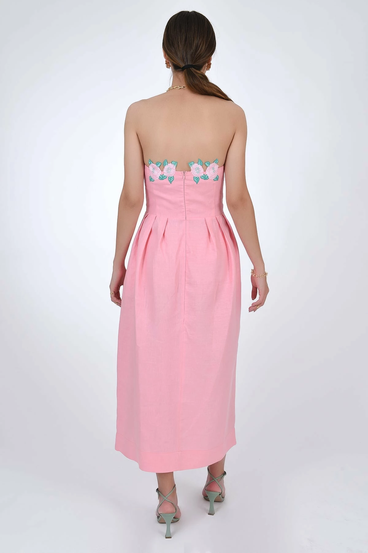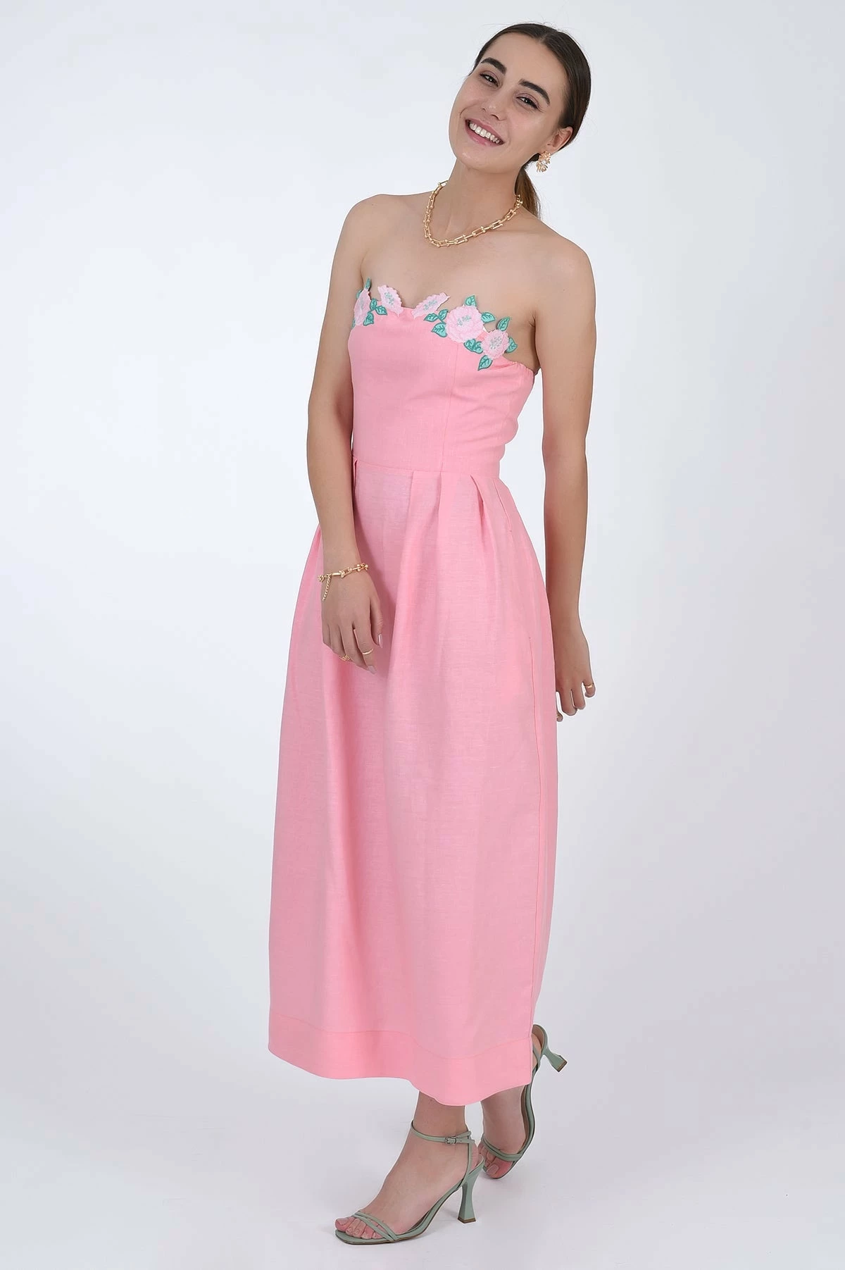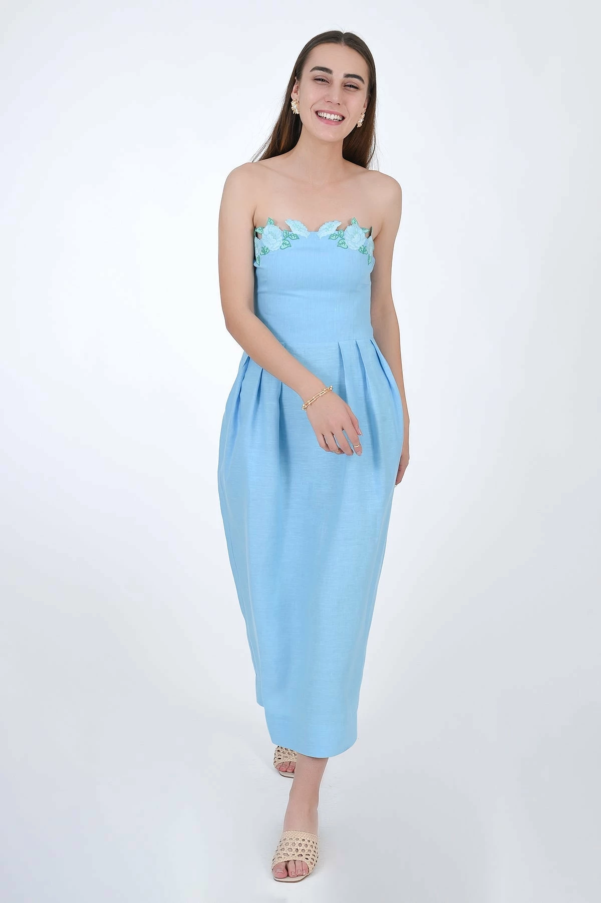 Strapless Linen Lorr Dress flaunts a sheath silhouette embellished with embroidered floral appliques in harmonizing floral hues along the neckline.
