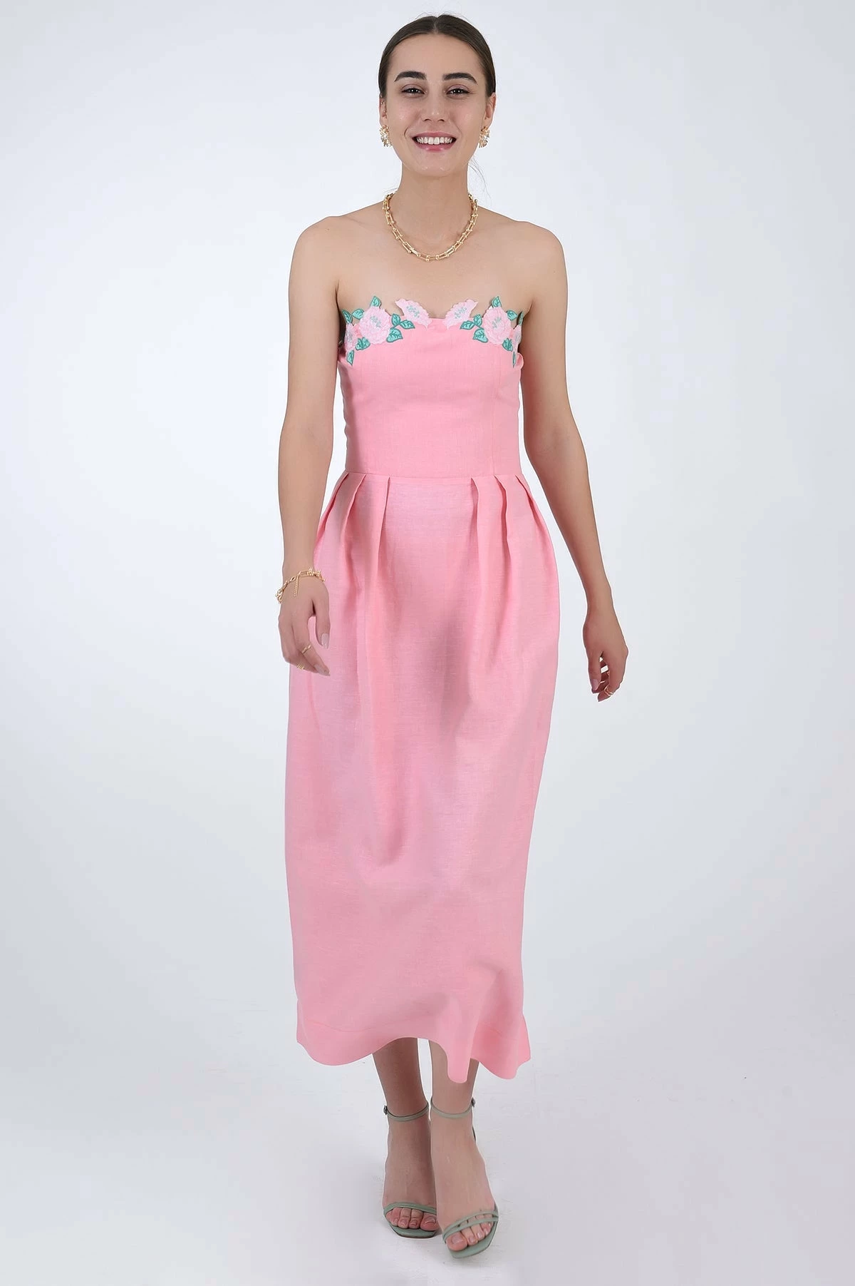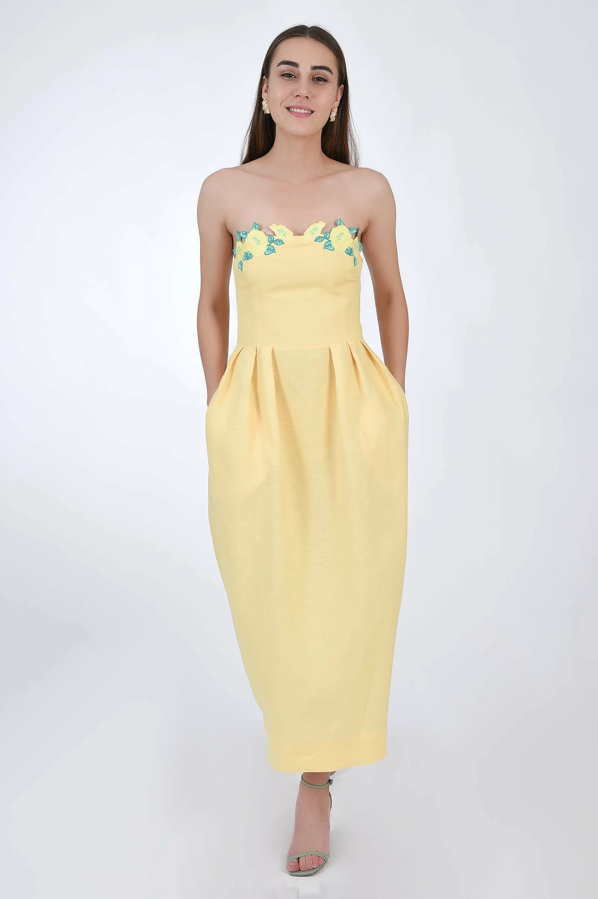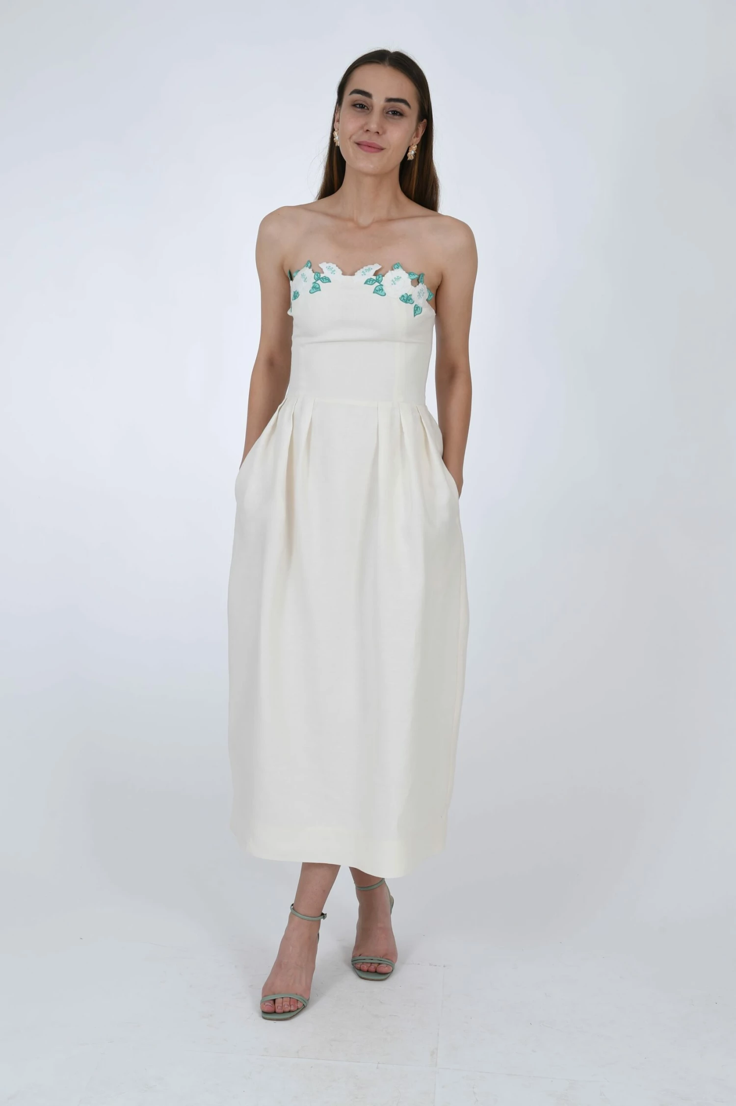 Strapless Linen Lorr Dress flaunts a sheath silhouette embellished with embroidered floral appliques in harmonizing floral hues along the neckline.