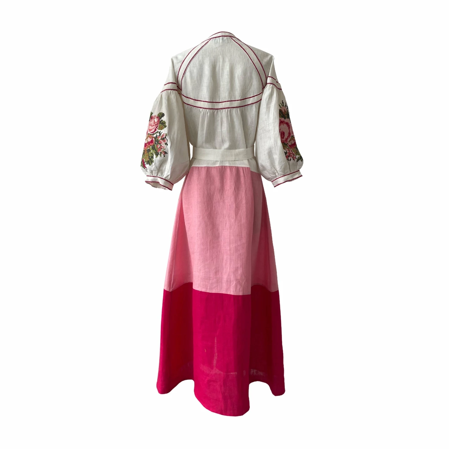 This colour-block dress is made from handwoven linen in the south of India. It features floral cross stitch embroidery and a belt.