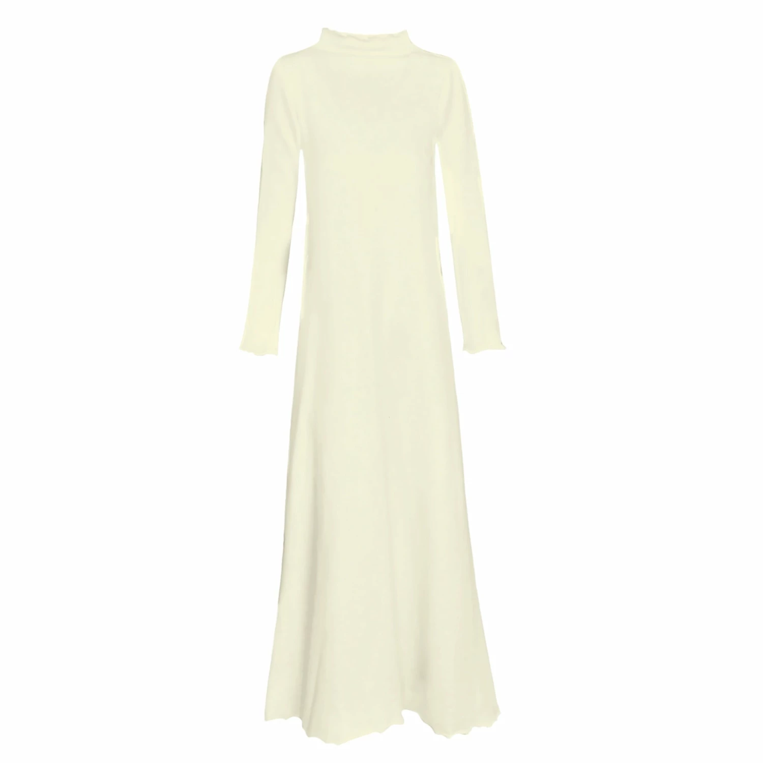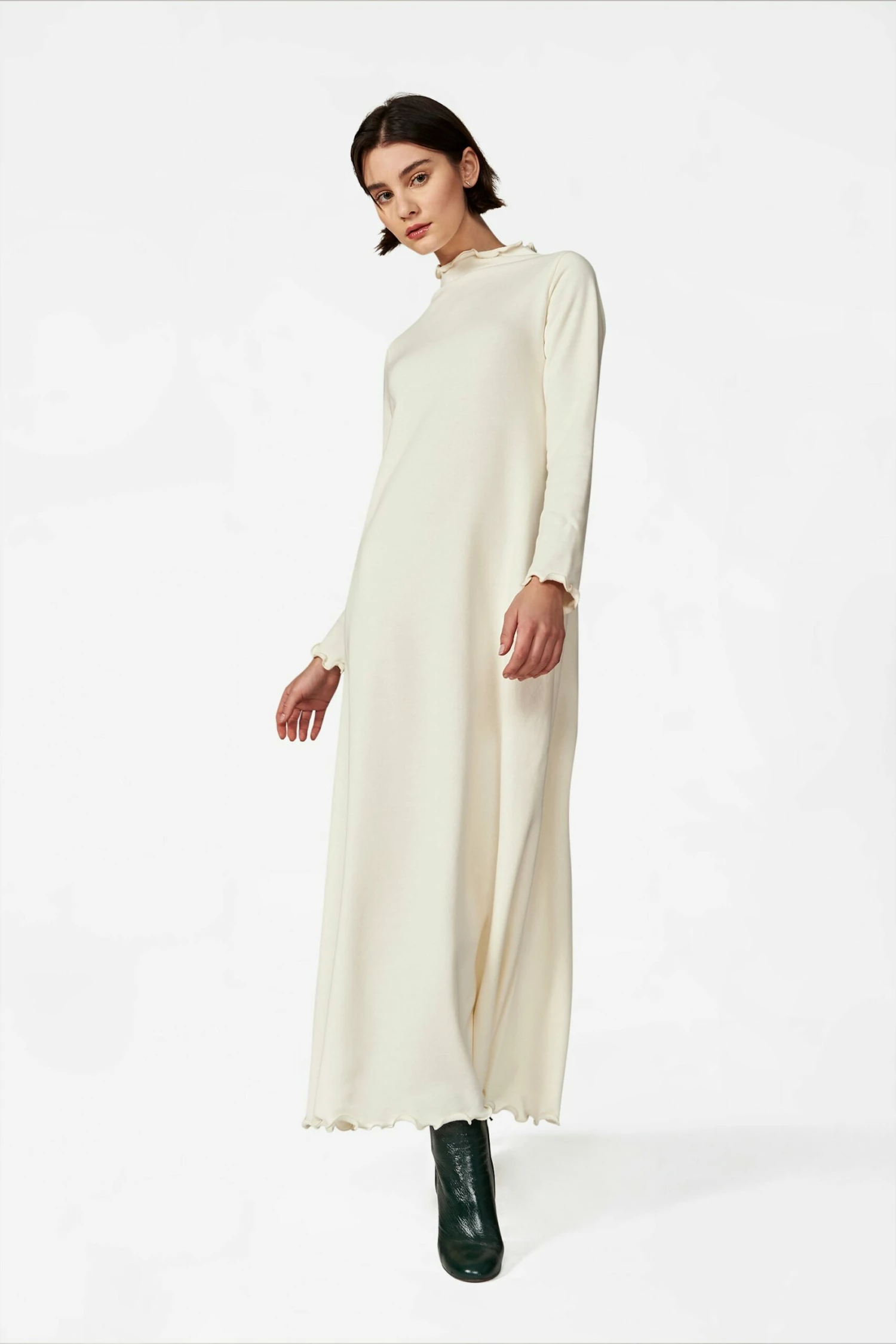 - Cream colored, medium-weight French Terry dress with raised neckline and embroidered lettuce edges