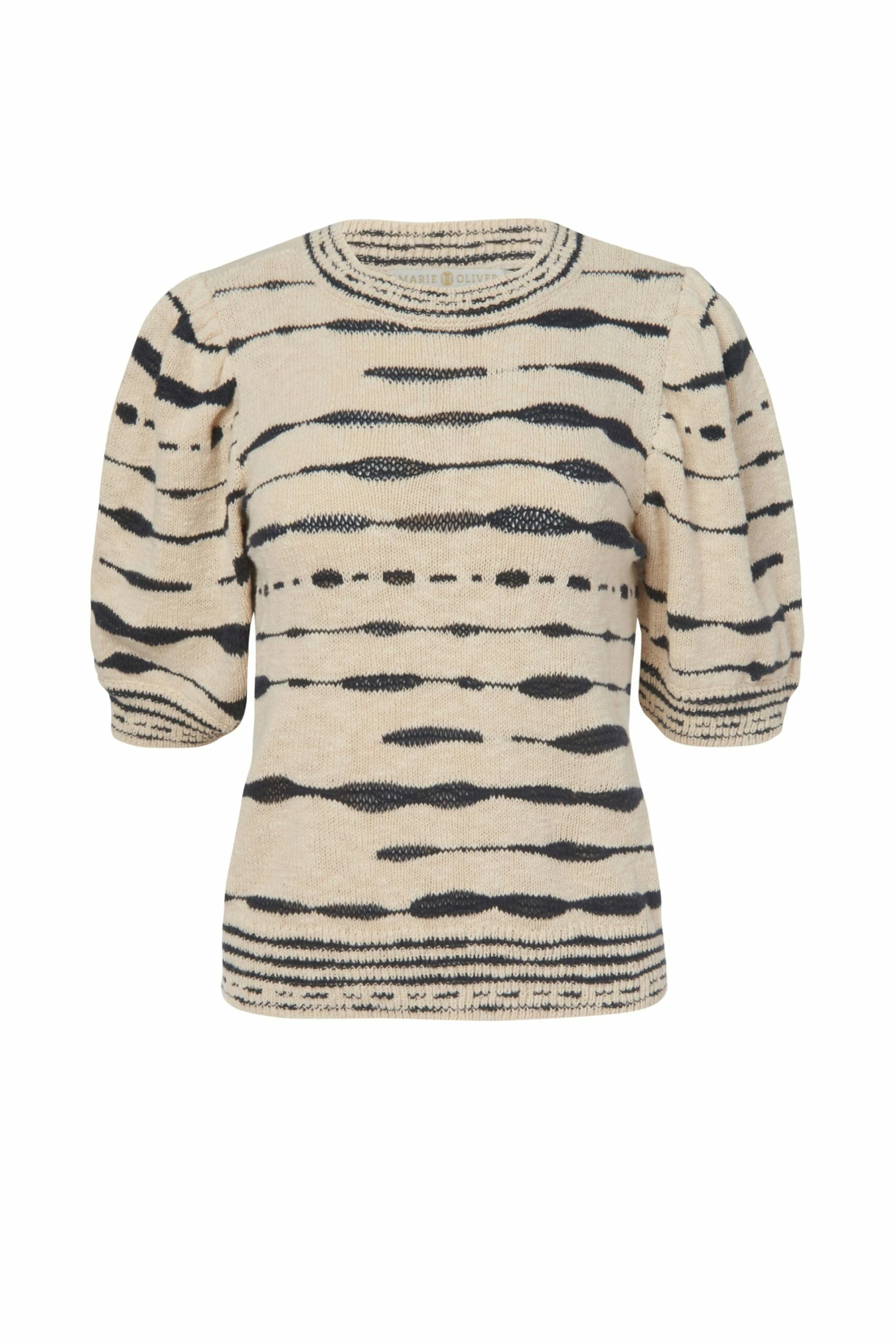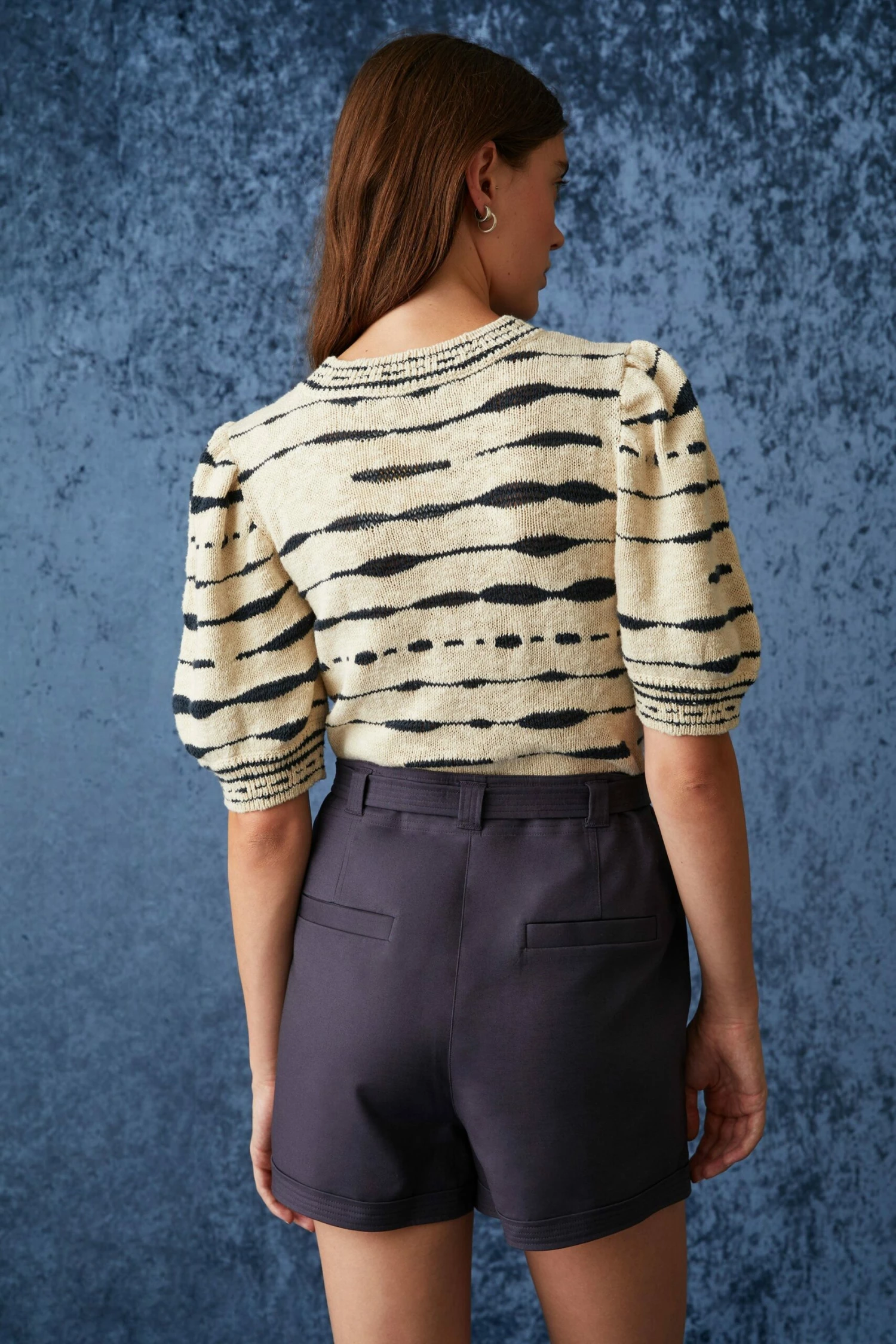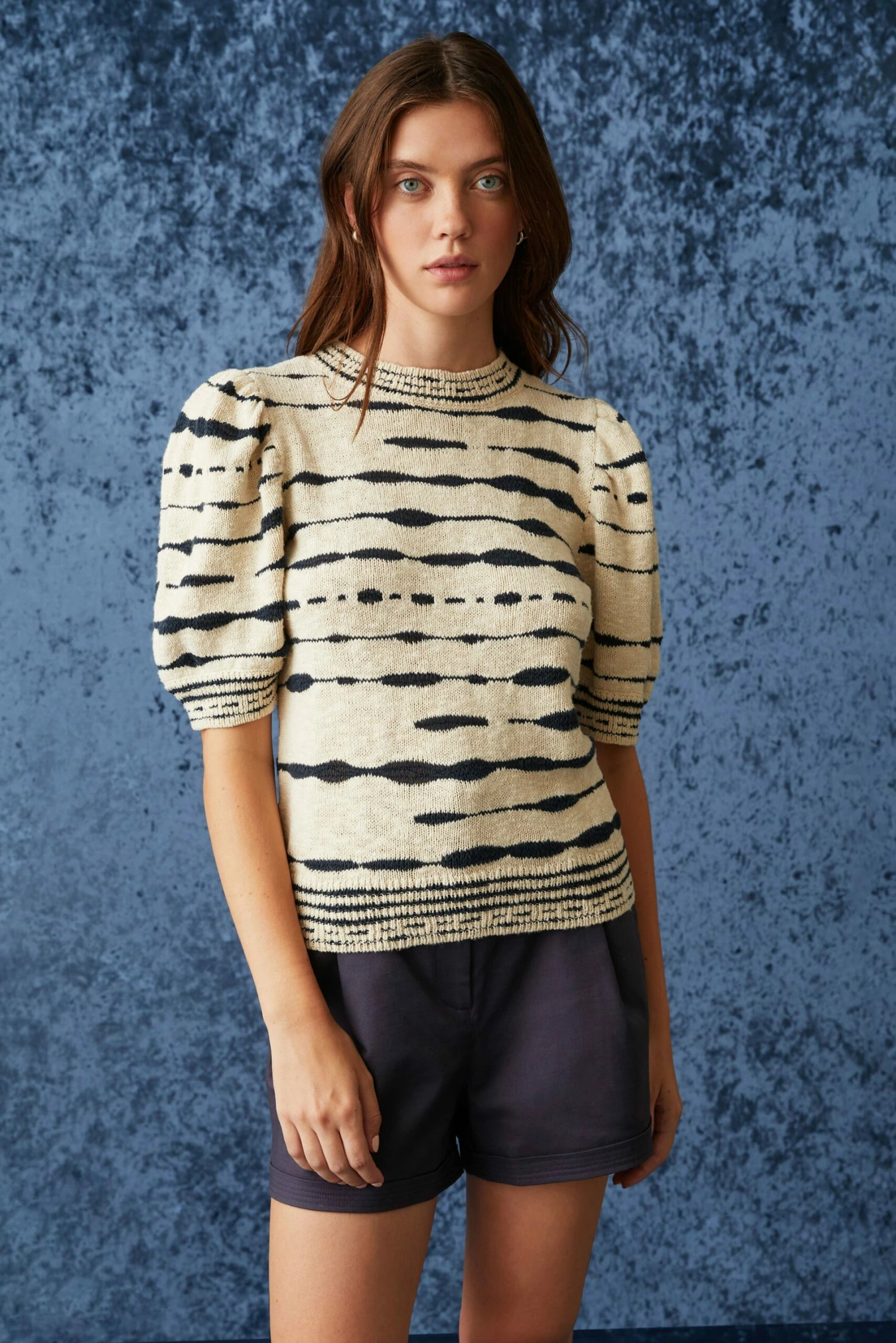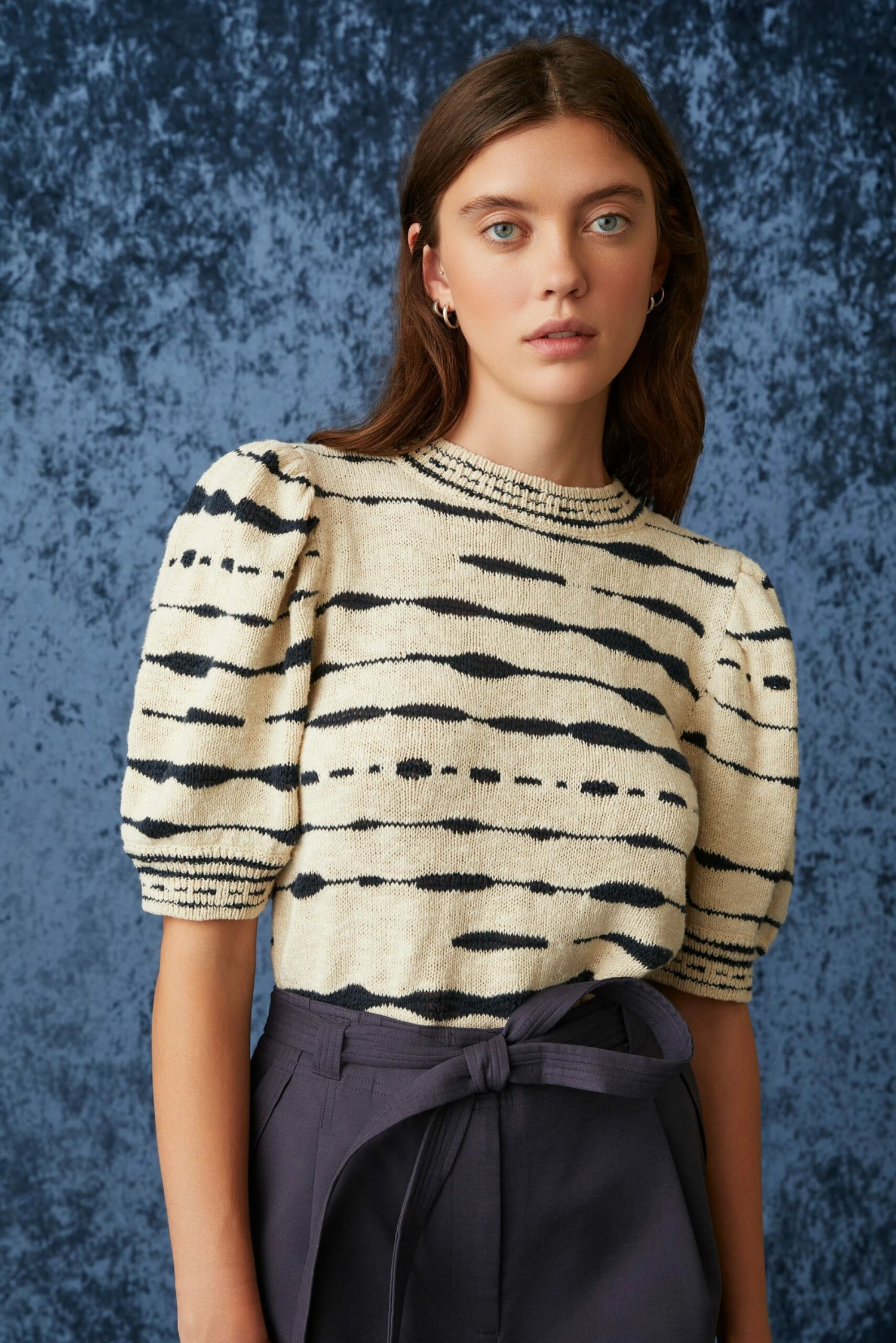 Maddie is a key novelty knit cotton with a slightly retro feel owing to its slub texture and groovy motif. In Current, the base is a warm neutral with deep navy contrast. The body of the knit is subtly fitted with gently puffed sleeves and high crew neck. As easy as can be to pair with cool denim.