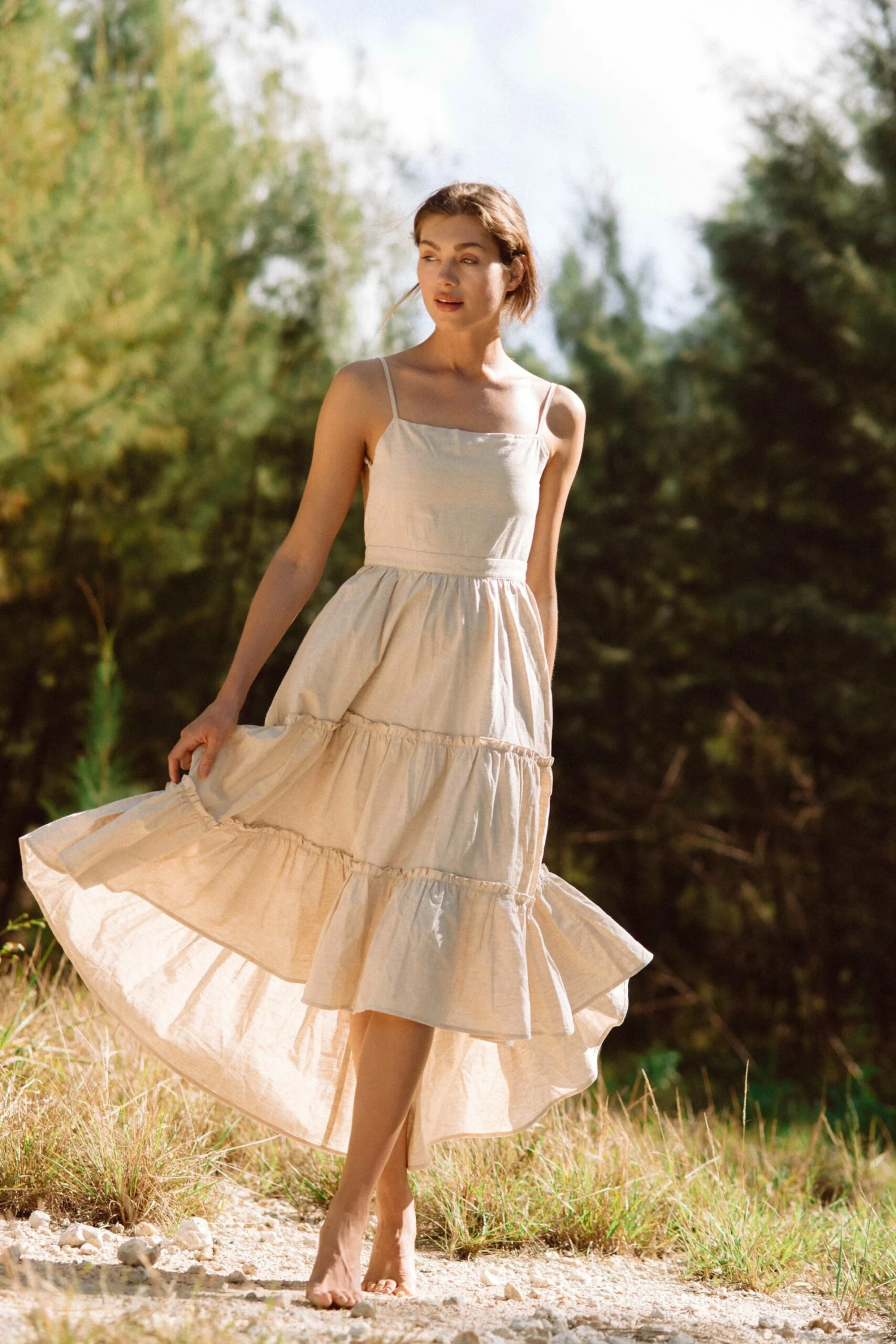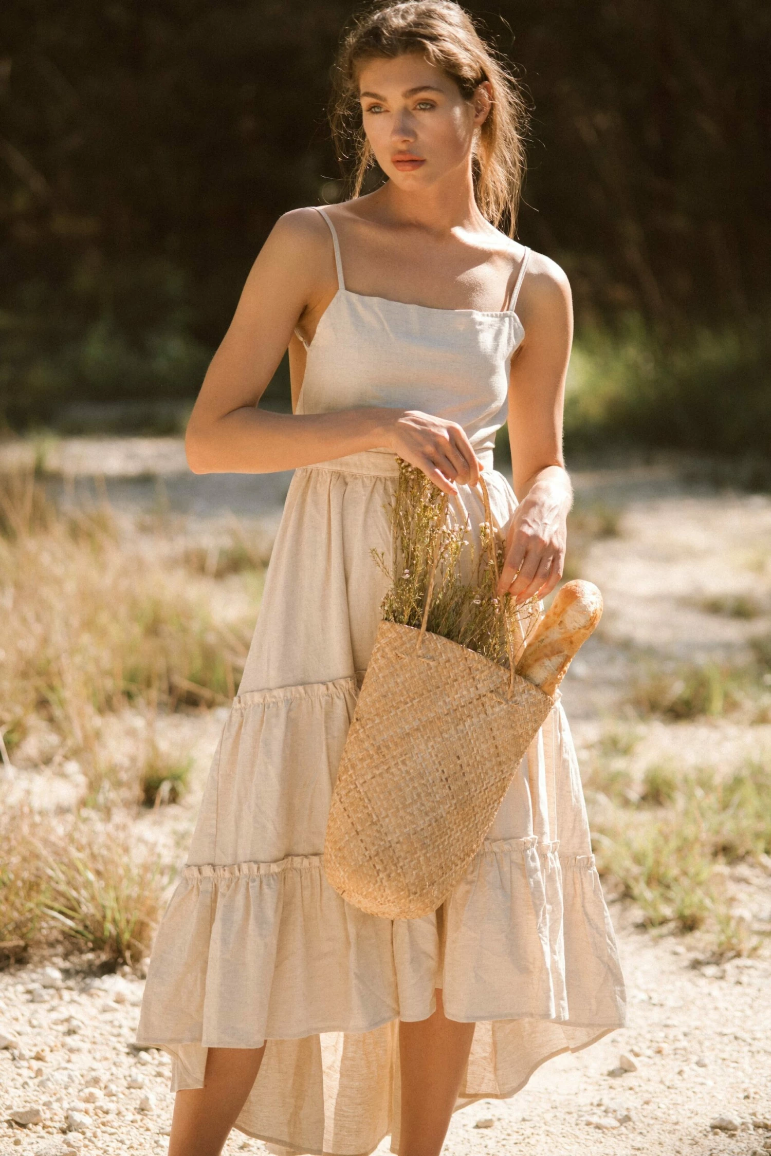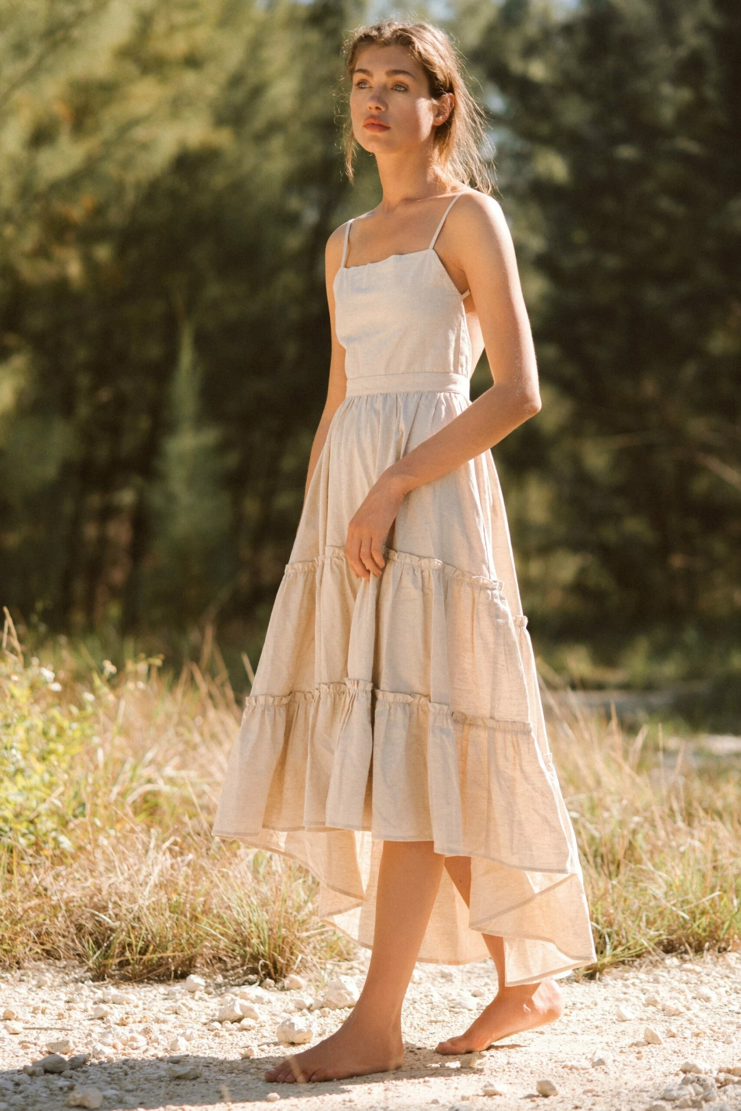 Meet the Malto Dress – our most romantic dress yet! It’s low back paired with the cinched waist, makes this dress extremely flattering. The torso is shaped in a classic apron style creating more coverage in the front and showing more skin on the side and back. The light-weight linen material, tiered ruffle detailing, and high-low length make this the perfect summer dress. Features adjustable straps.