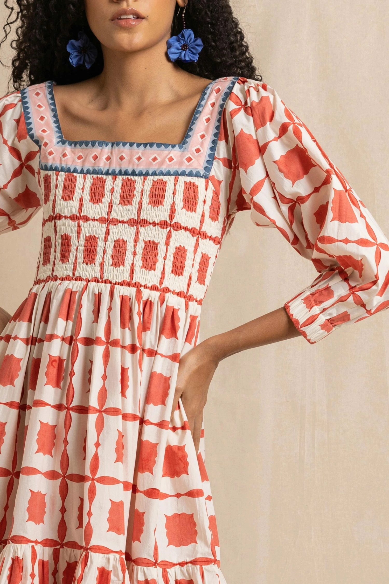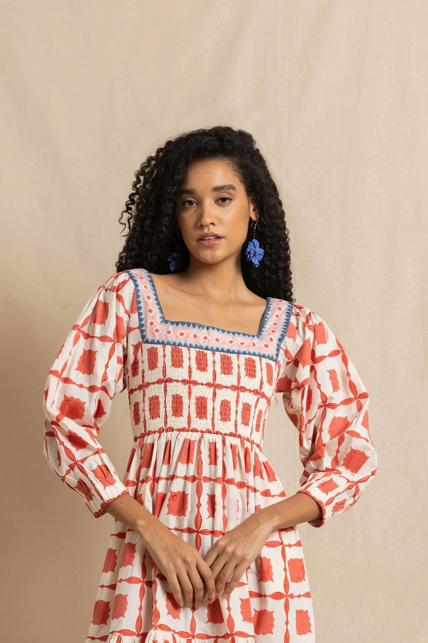 Hand-block printed on soft cotton poplin, the top is smocked and gently fitted and the sleeves are full with elastic at the cuffs.Â