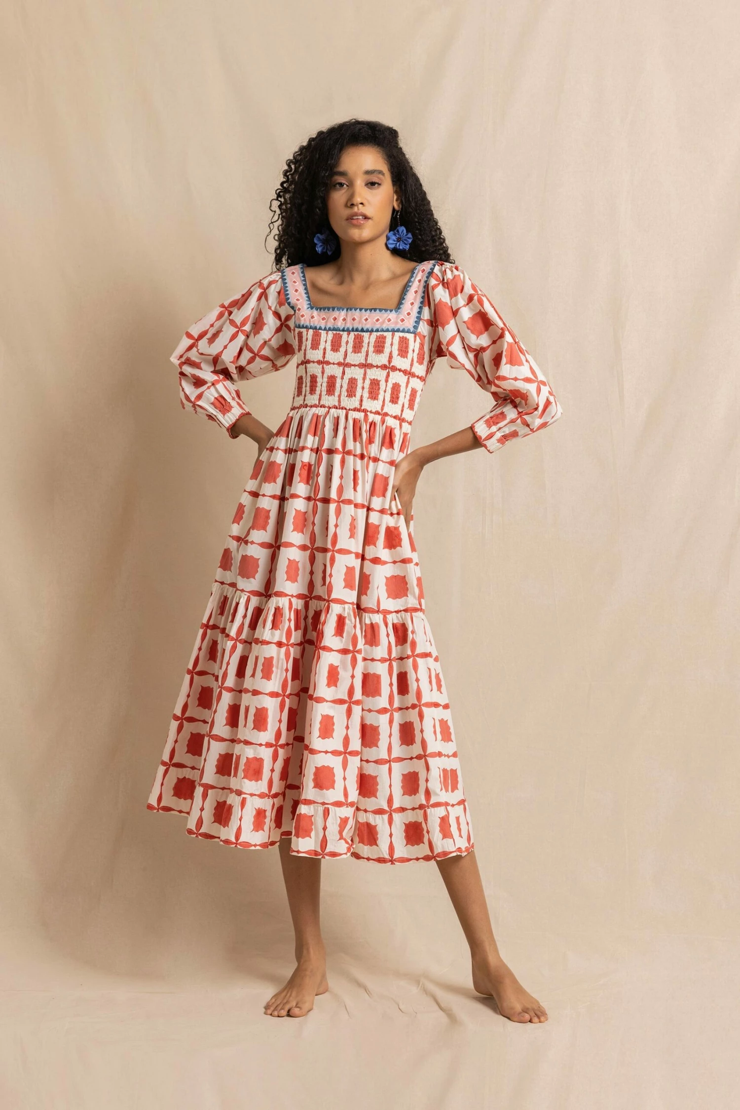 The fabulous Mathilde dress in our vibrant Coral Lisboa block print, with contrast border. With a wonderfully full skirt, this is (another!) perfect summer dress