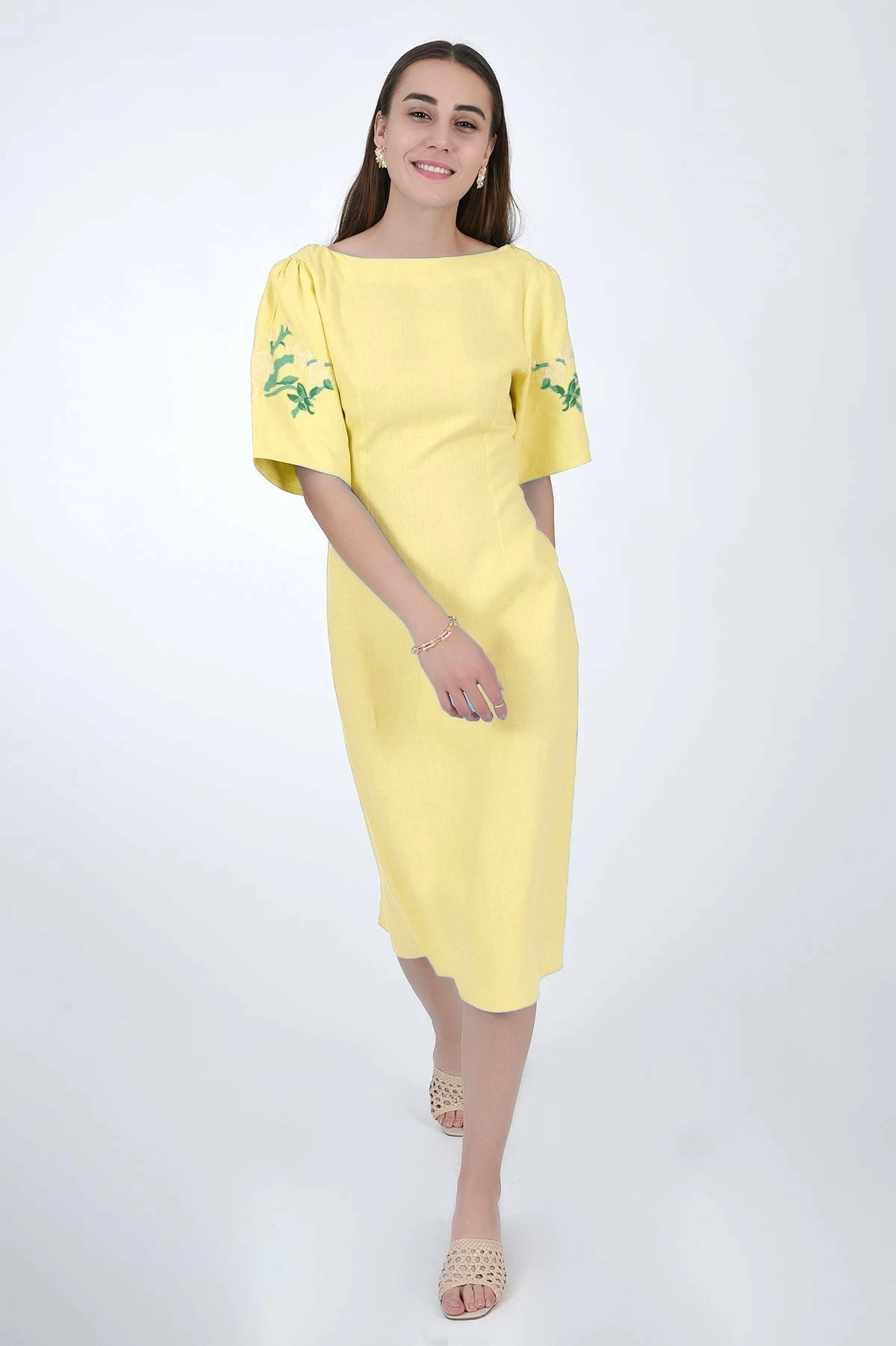 This Midi Linen Dress is the epitome of style, perfect for a special occasion or just an everyday look. Featuring a boat neckline, short sleeves, and floral embroidery detail, with a deep V open back and belt that ties into a charming bow.