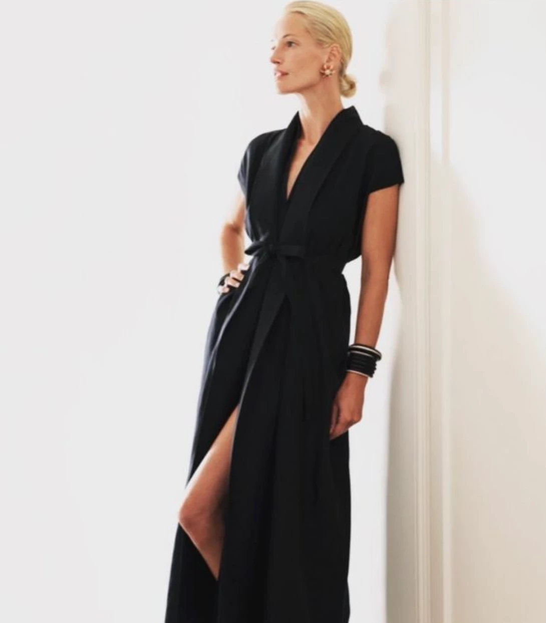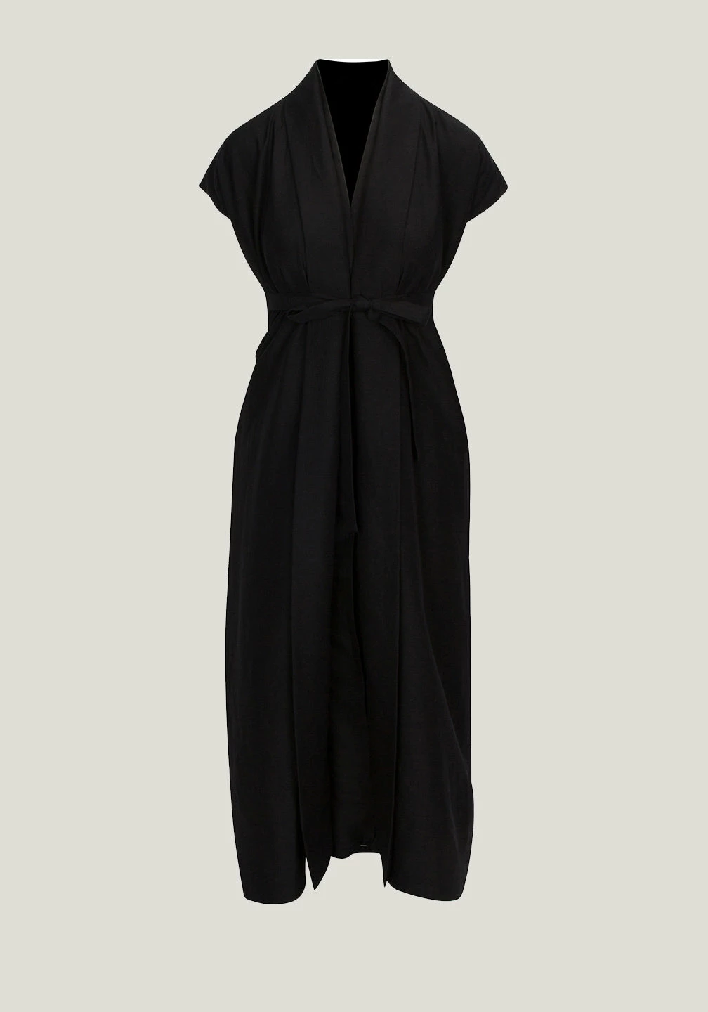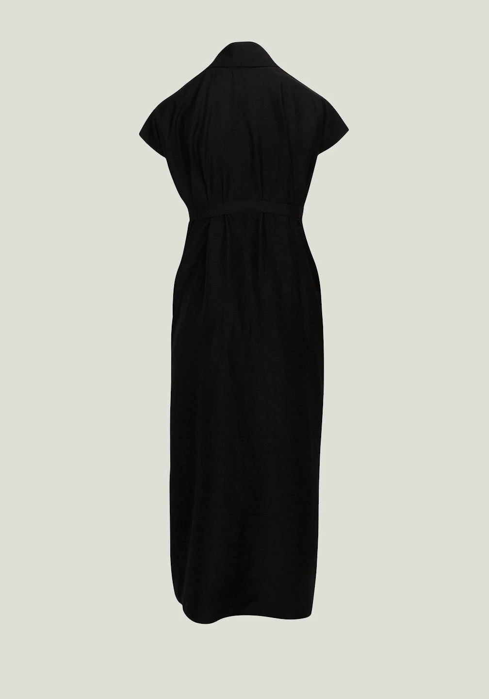 Empire waist, stiff shawl collar, cap sleeves