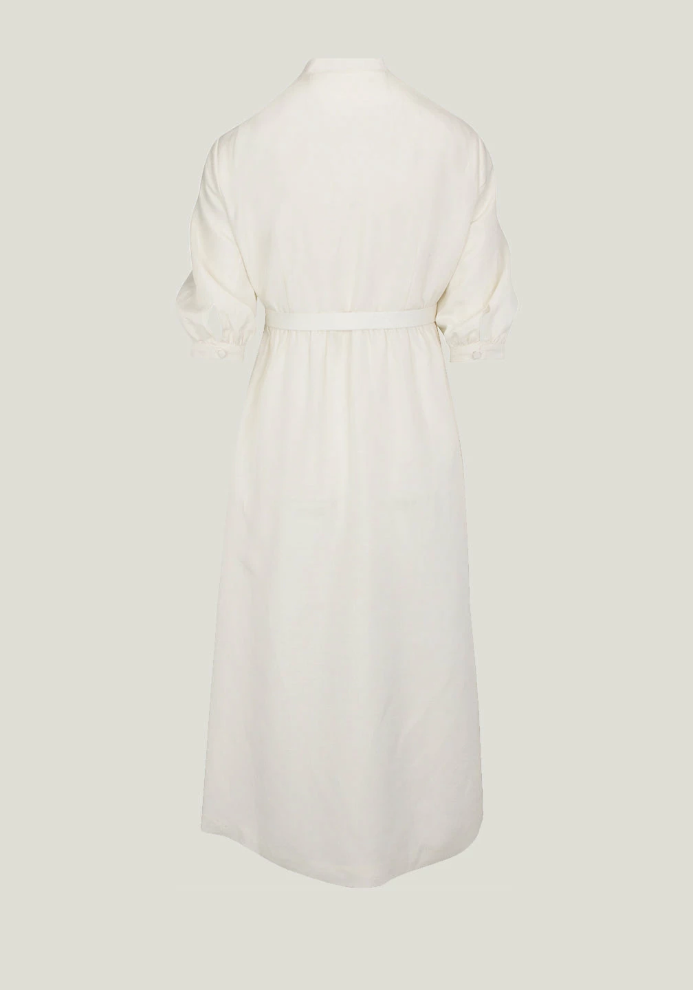 One inch belt with velcro closure, below elbow length sleeve with button closure and fourteen buttons down the front Empire waist