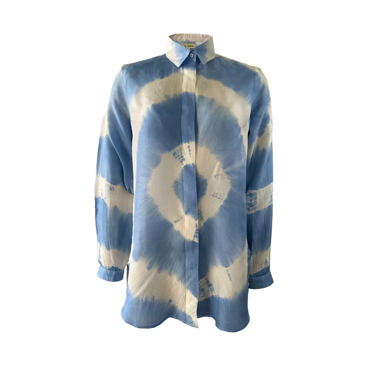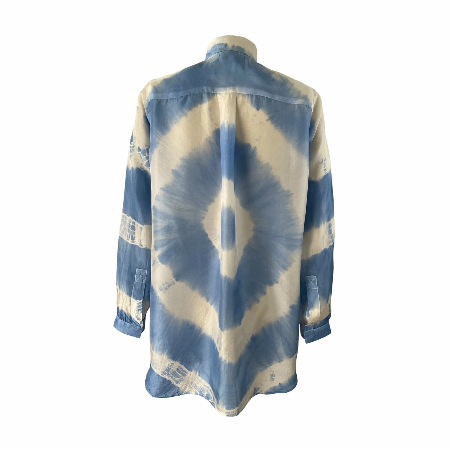 This one-of-a-kind long sleeve shirt is made from a fine Chinese satin silk . It features Tie-dye technique in baby blue and natural off white color.