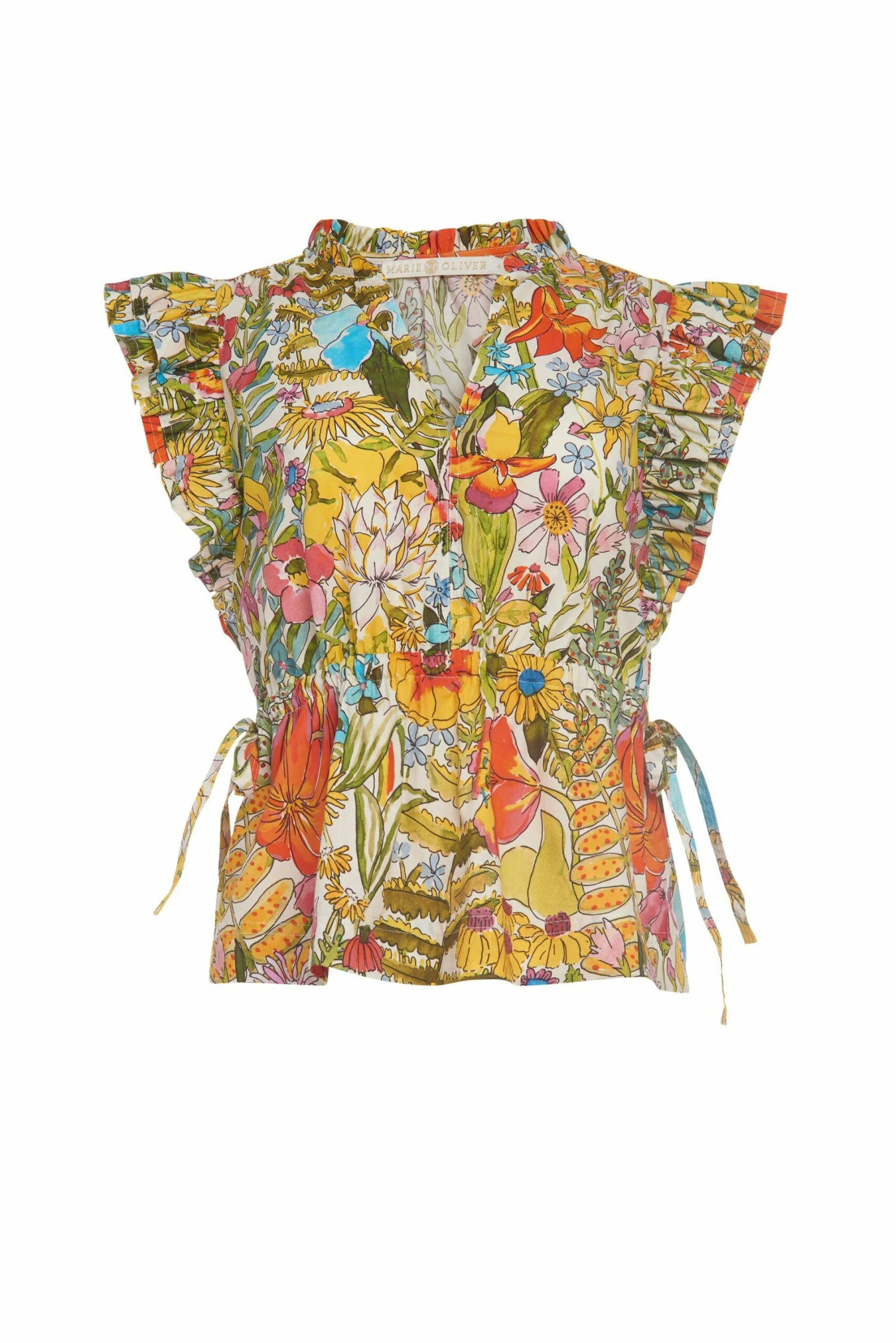 Our Olive Top is an easy and feminine wardrobe staple that plays with structure and volume. Asymmetric ruffle sleeves are offset by a gently cinched waist, tying with a drawstring on either side. Pictured here in our favorite new Botanic floral print – with a hint of black – it pairs beautifully back to black for a seasonal work look, or to our coordinating Botanic Eryn short for a chic and festive set.