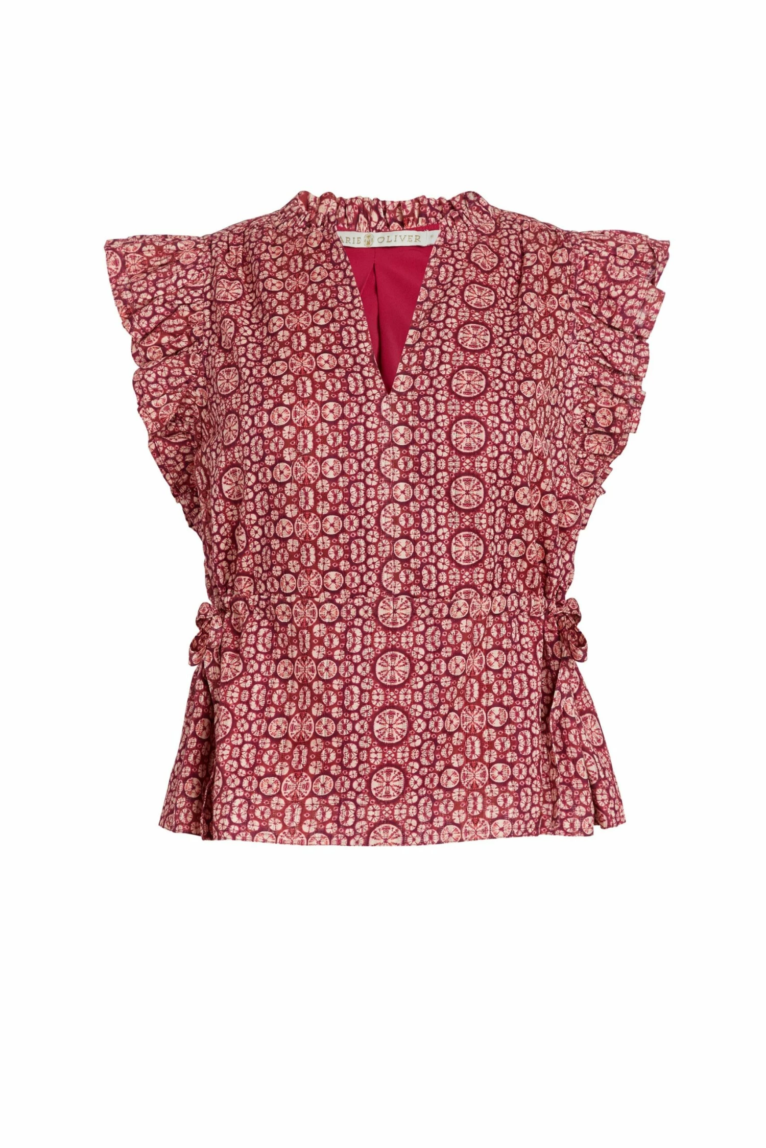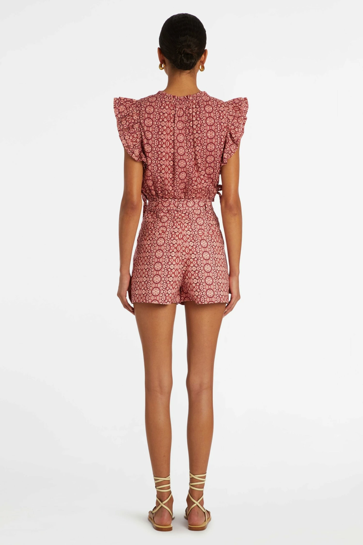 Having fun with texture and volume, our Olive Top comes in a beautiful cotton dobby and features asymmetric ruffle sleeves that are offset by a gently cinched waist, tying with a drawstring on either side. Our Hibiscus Shibori—a punchy stamped motif in an inky blend of berry reds and pale pinks—underscores Olive’s playful vibe. Make her a set and tuck Olive into our matching Eryn Short.
