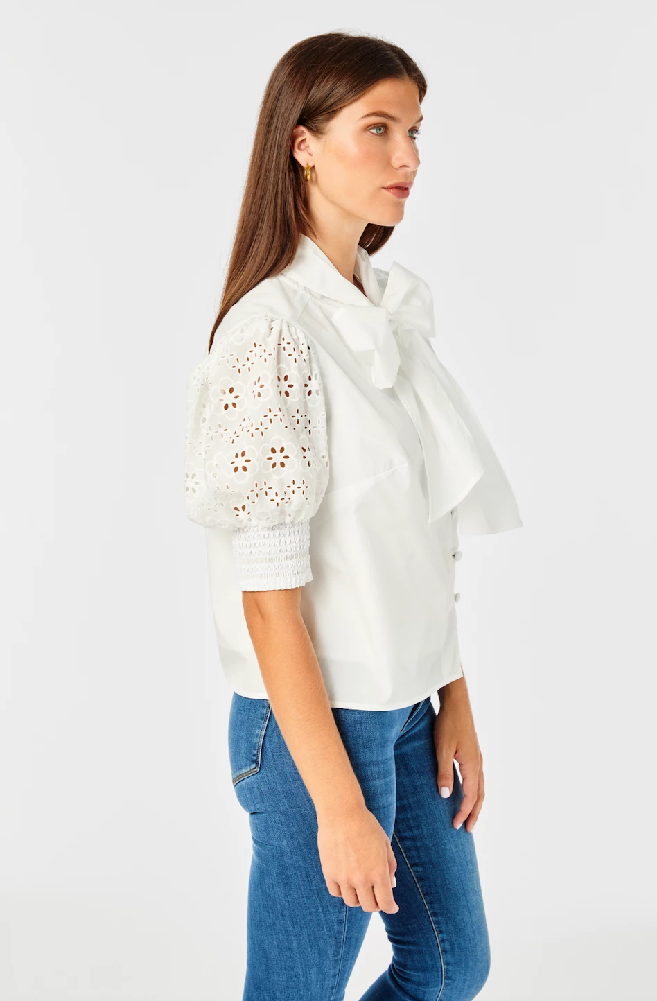 Inspired by our brand’s most important muse, our founder’s mother, Peggy. The Peggy is a best-selling top pulled straight from faded photos of yesteryear’s European travels. This blouse features a smocked cuff band with custom embroidery, side vents, a box pleat on the back, and a sweet bow at the neck. The fabric offers the stretch and recovery of spandex for soft breathability and moisture-wicking smoothness. Designed, smocked, dyed, and sewn in Los Angeles.