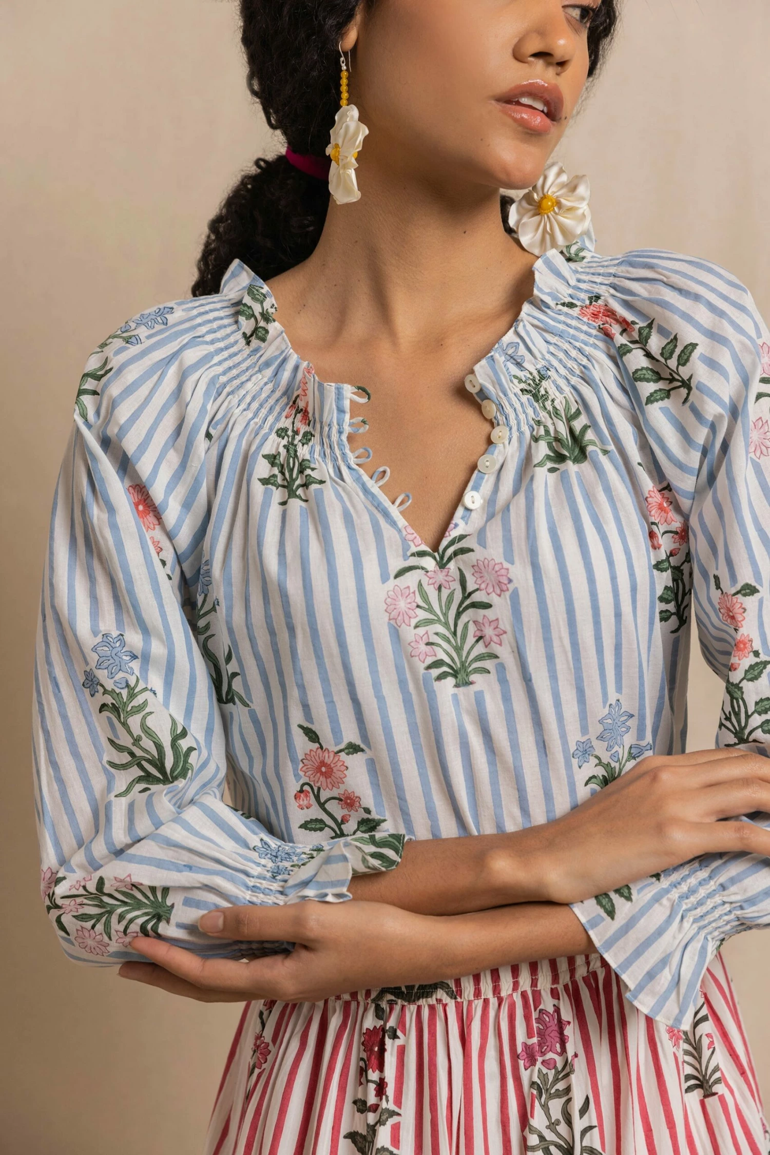 Cut elegantly wide at the neck, this is a beautiful shirt to pair with one of our skirts or with a favourite pair of jean shorts for a summer day.Â