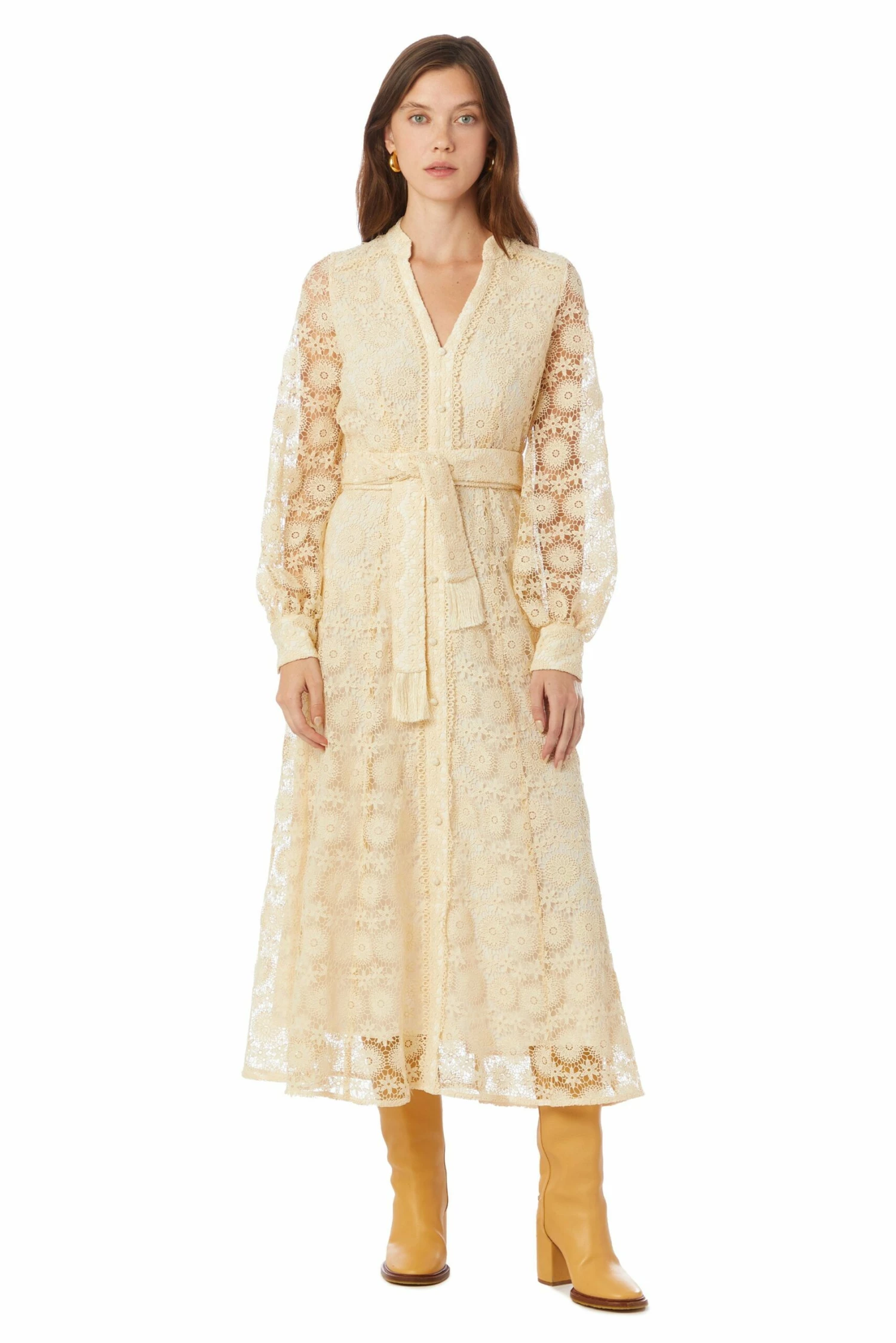 Priscilla speaks to a range of tastes and styles, where classic shirt dress lines meet bohemian elegance courtesy of a gorgeous floral lace and a fringe-edged sash belt. Fully lined, Priscilla is a great addition to your wedding trousseau.