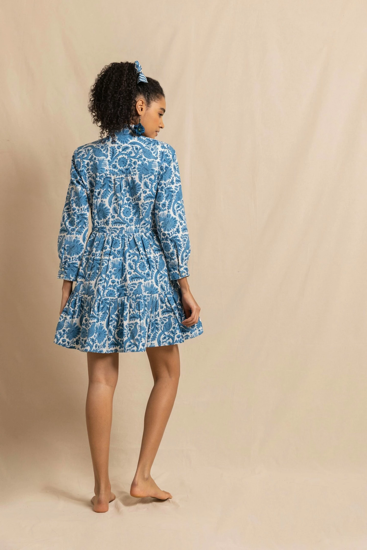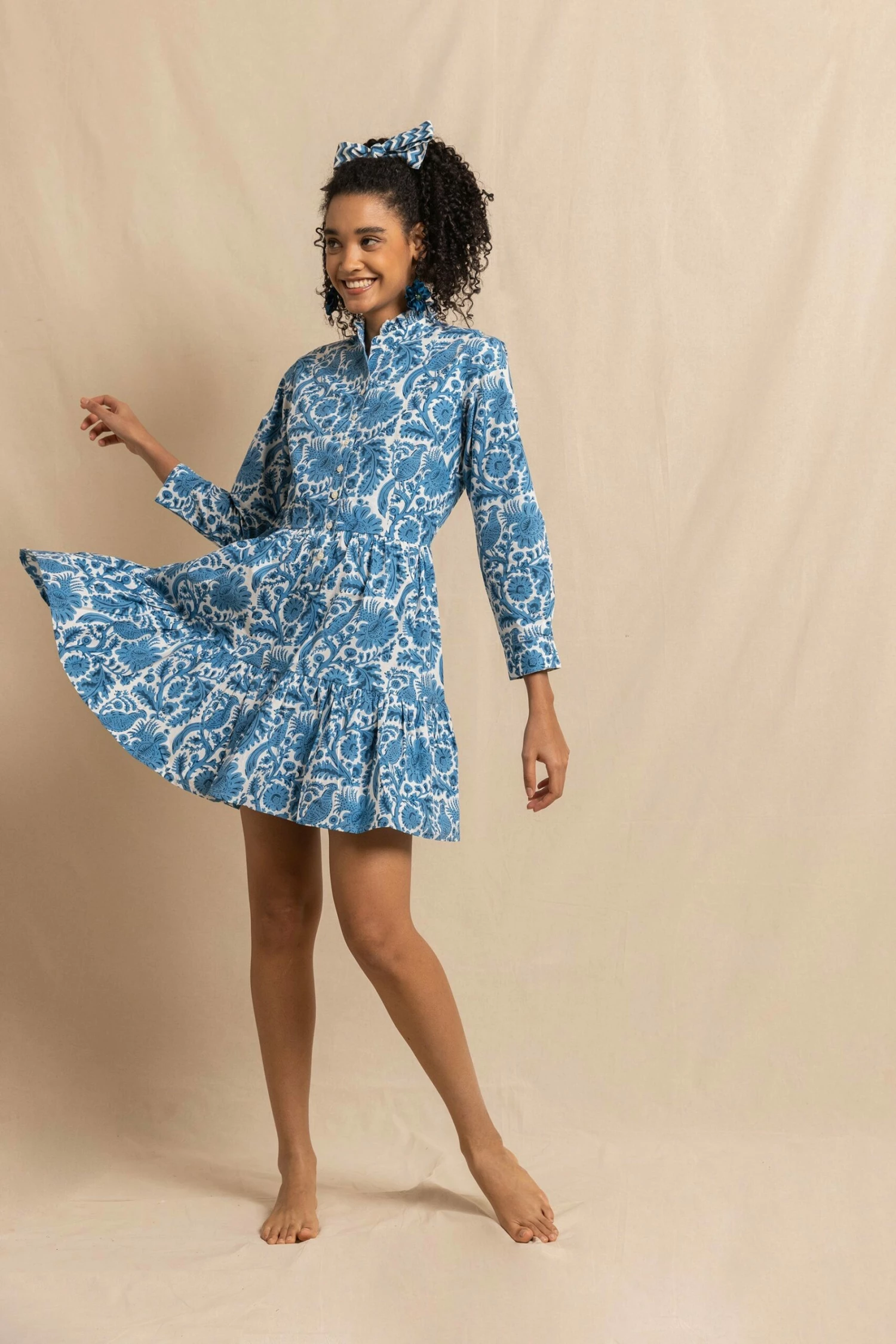 We had so many requests for a shorter style, we thought a Dakota Mini would be a good place to start. Falling just above the knee, this new version of our best-selling style is hand-block printed in our signature Blue Pheasant design. With a delicate frilled collar and button cuff, she’s got all the structure of our classic Dakota, but now your legs go free! Wear with a casual summer flat, or pair in cooler weather with tights and boots!