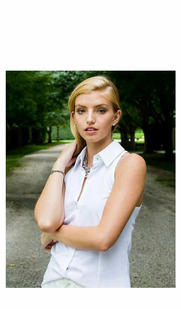 The racerback style of this piece allows for free arm movement, and the pique fabric has a little give for big swings. The darts nip at the waist creating an hourglass silhouette. The refined shape of this collar is regal and soft on the neck. This feminine shirt will stand the test of time.