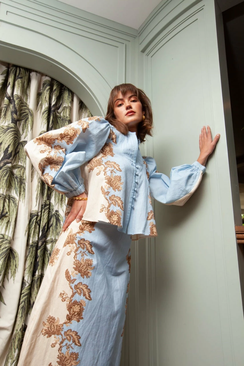 The Taylor Blouse is crafted with linen material and designed with pleated detailing along the chest and covered buttons. Its balloon sleeves add a touch of sophistication to any outfit. Perfect for any special occasion.