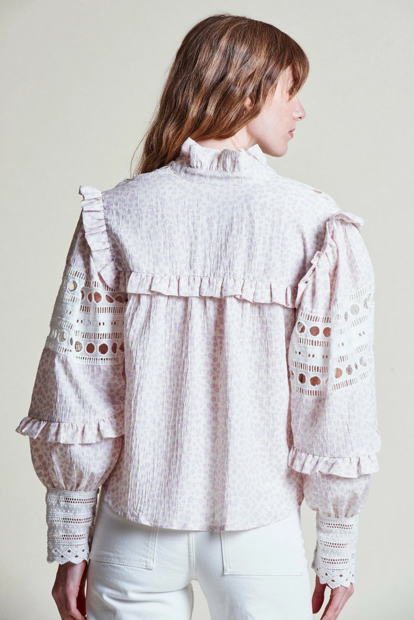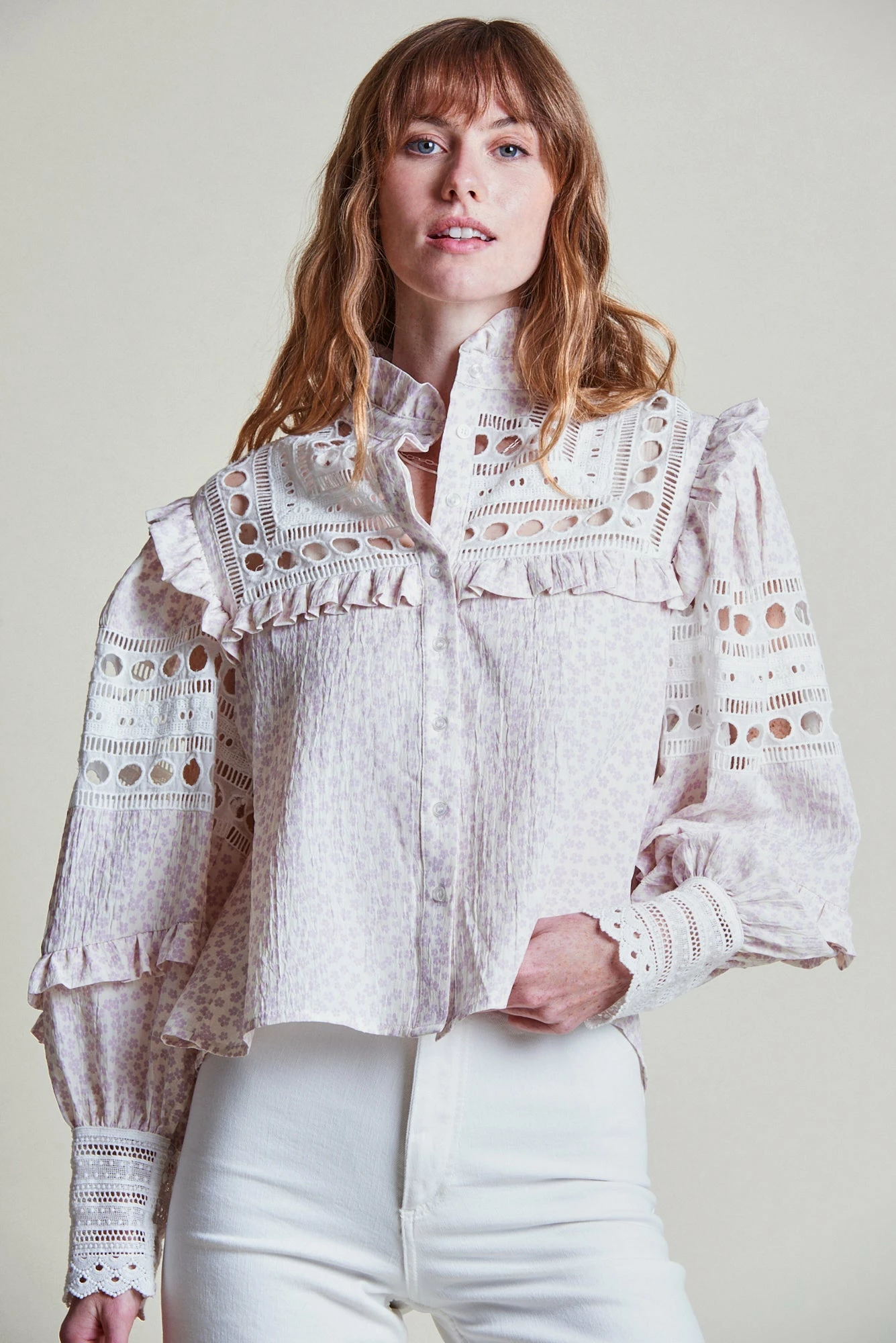 Our Danielle Shirt is constructed in super luxe textured cotton with lace inset details and crochet trim. A slight a-line shape flows away from the body.
