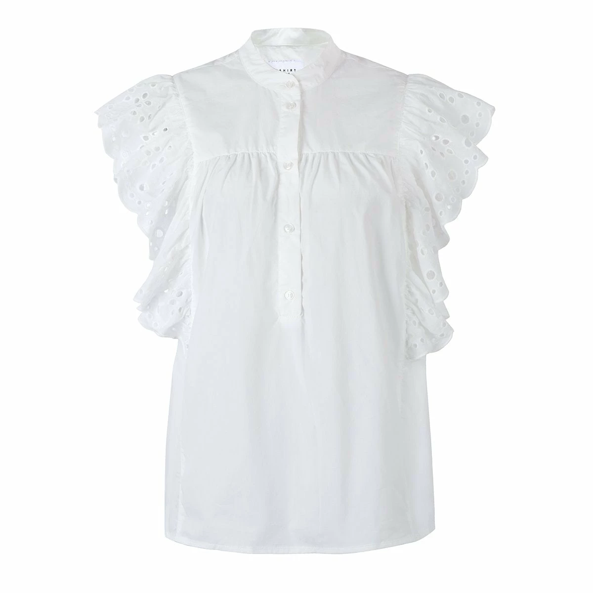 With eyelet lace trim, our Scarlett Shirt has gone sleeveless. Loose, tunic-y style that can be tucked in our worn out.