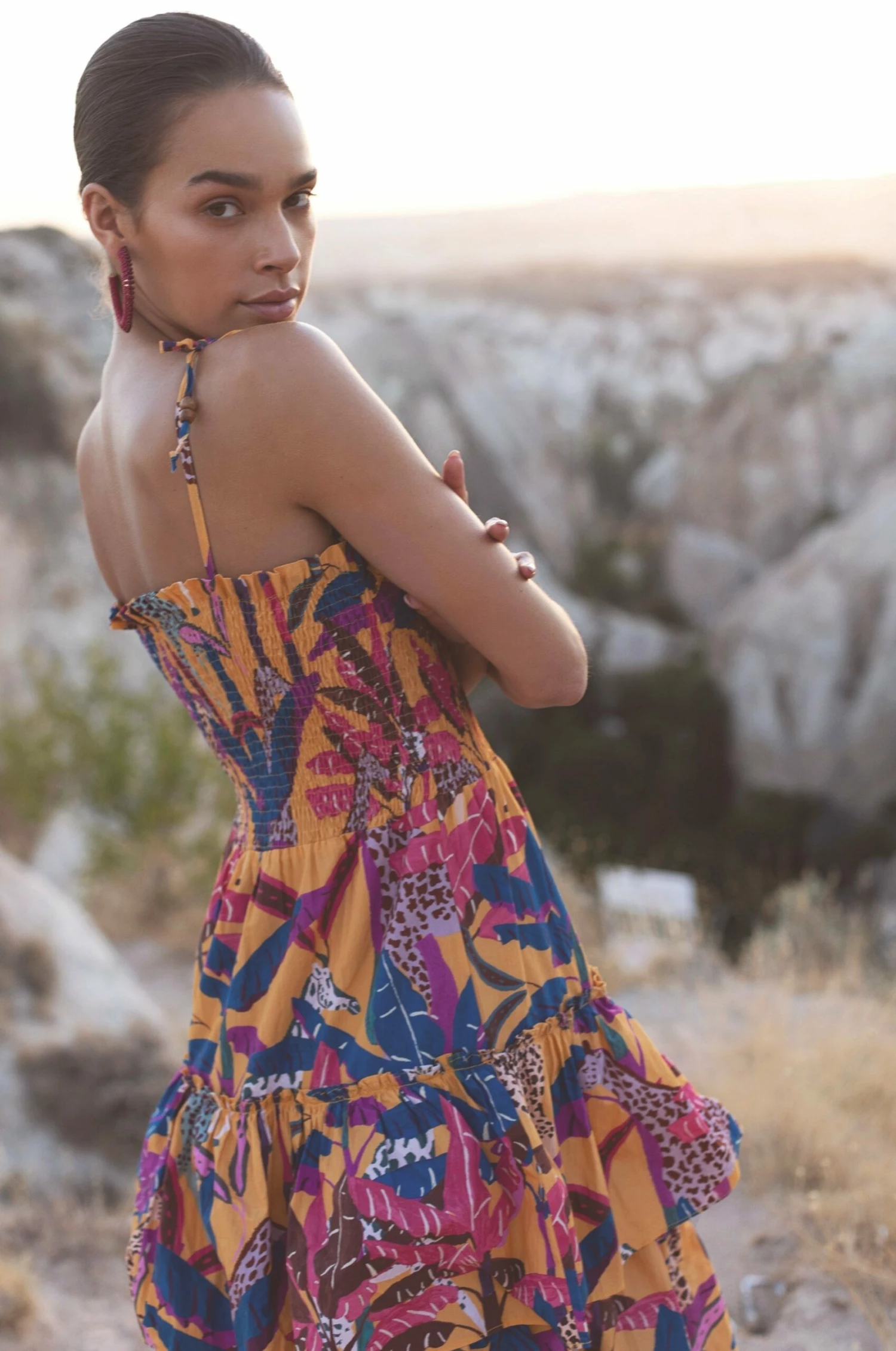 The Tie Strap Smocked Midi in Kruger Saffron is a perfect mix of casual and formal, giving you a fresh summer look that feels like it belongs in the sun! This distinct style features a smocking detail on the straps, making it an eye-catching addition to your wardrobe. Offering a sophisticated and stylish feel, this must-have piece will turn heads wherever you go.