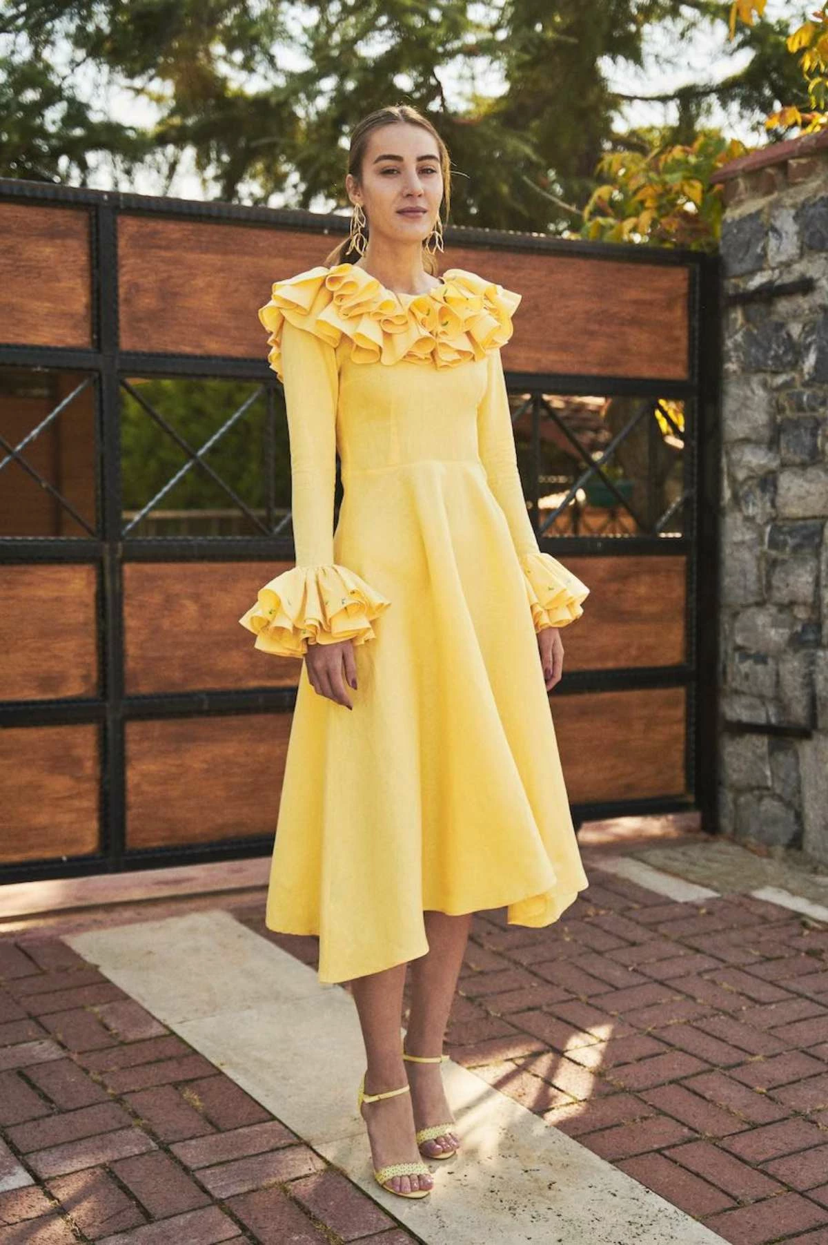 Stunning 100% linen ruffle dress. Featuring a ruffle neckline and long ruffle sleeves, this midi dress boasts a silhouette that flatters any figure. The button-back closure adds a touch of elegance and sophistication.