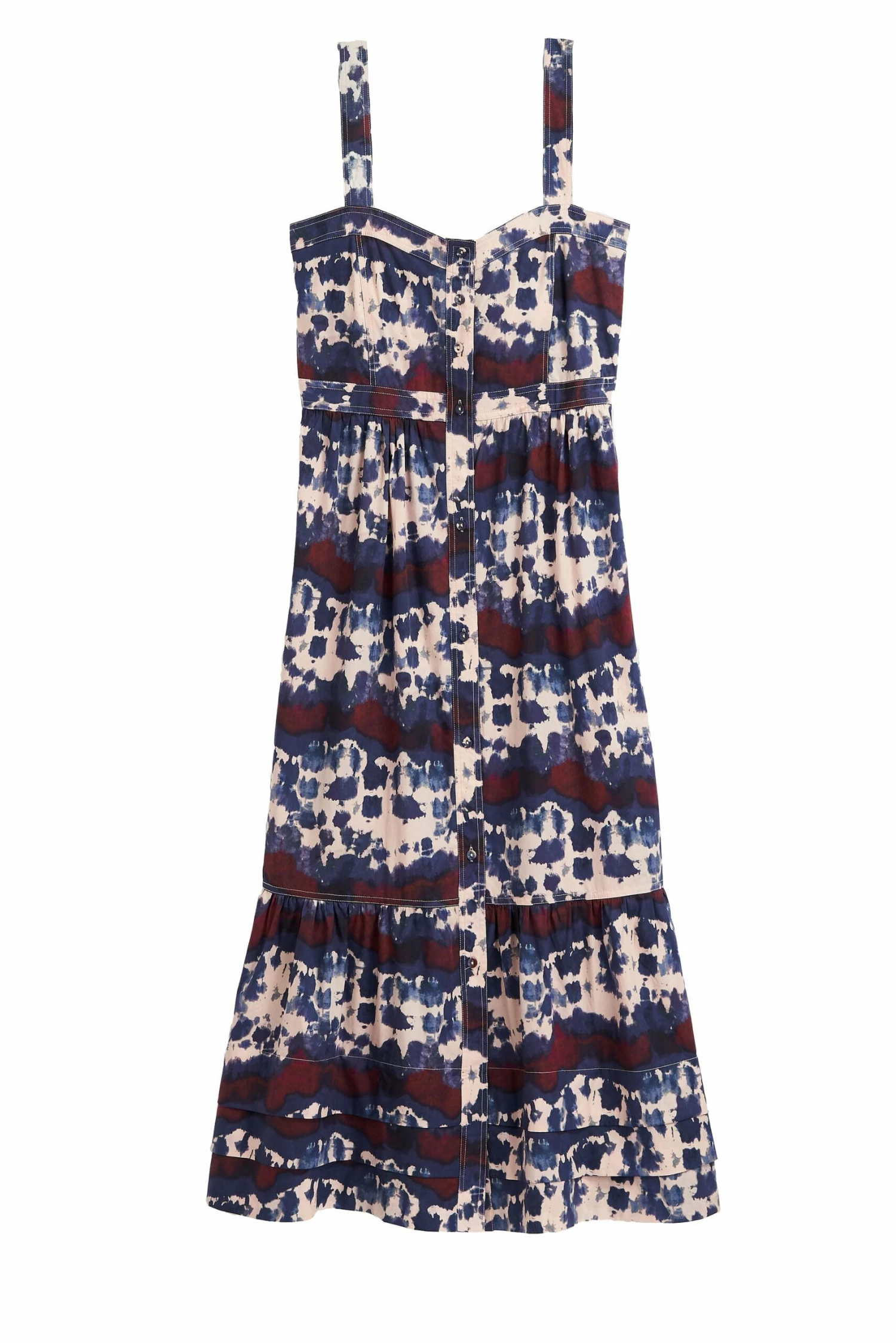 Toss on our Yara midi with sneakers and a jean jacket for a wear-right-now look. Or tuck the slip-on style, which features functional buttons down the front, adjustable straps, and smocking across the upper back, into your suitcase if you’re bound for warmer climates this fall and winter. Our new Midnight Ice Dye print adds dimension and interest to the wear-everywhere dress courtesy of the patterns organic dye effect and contrasting pastels and inky blues.