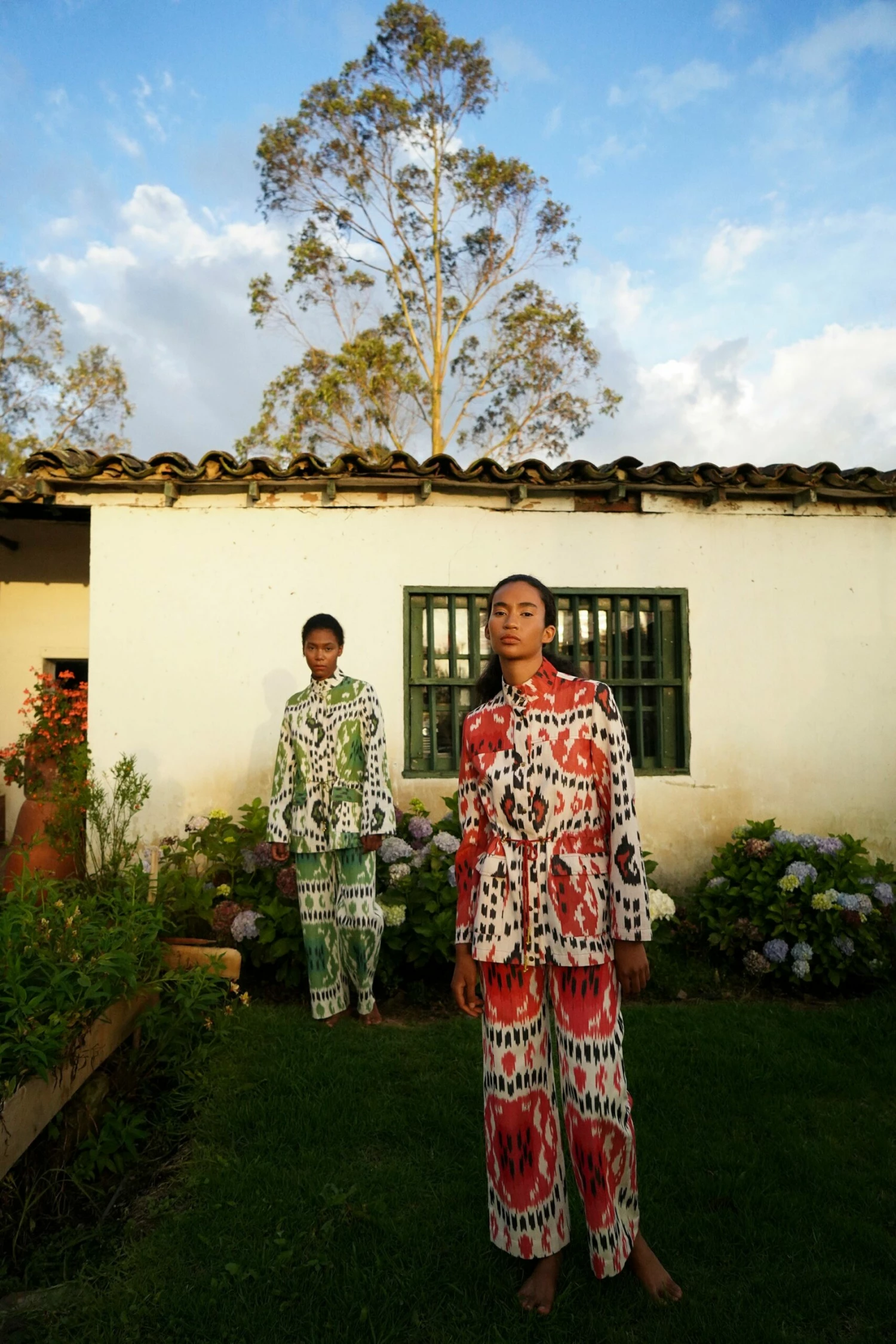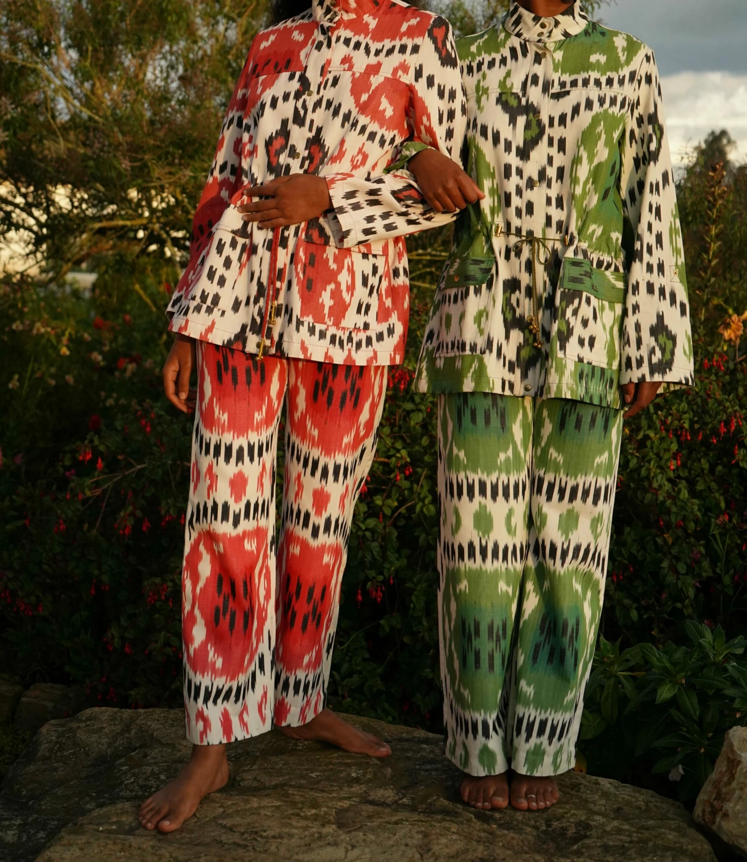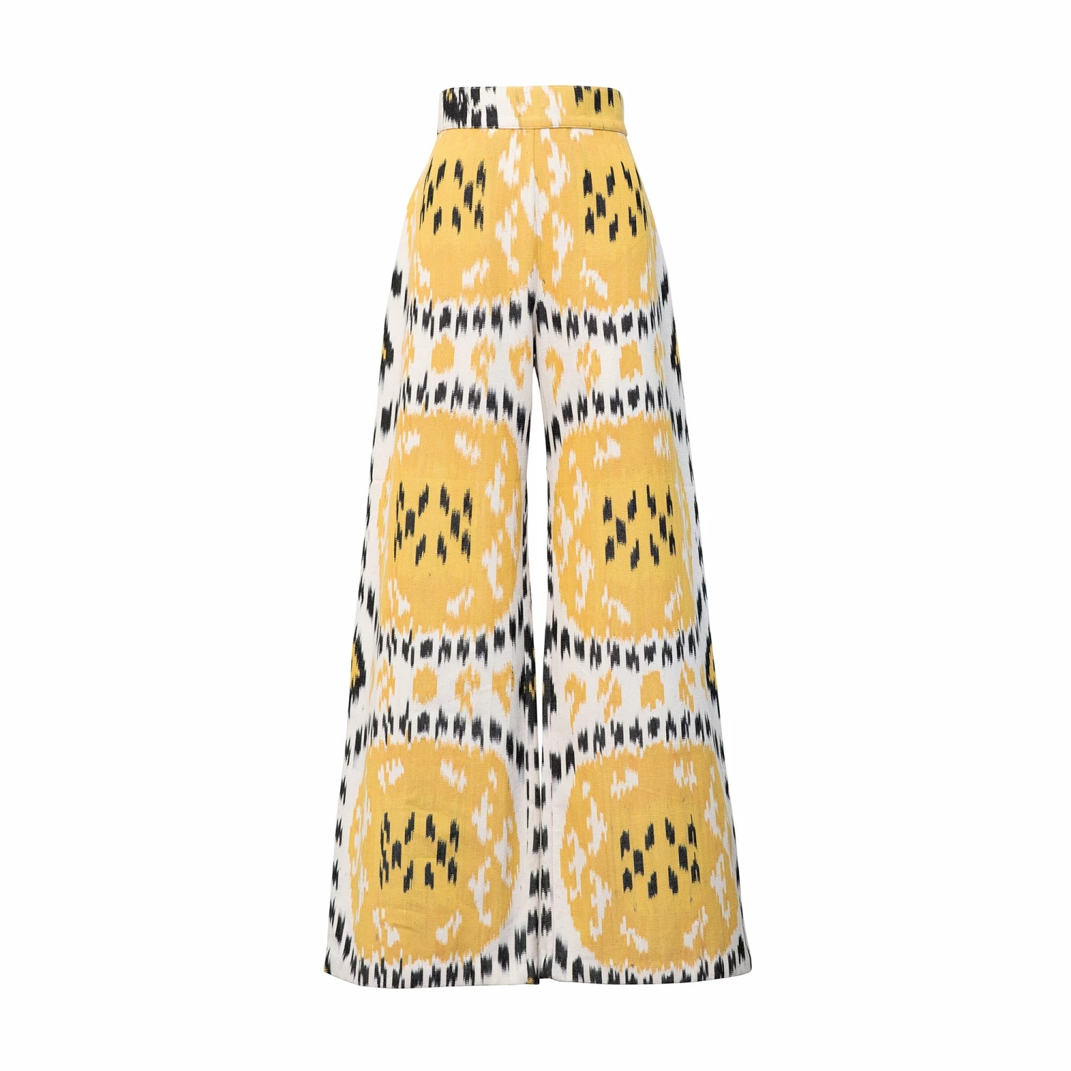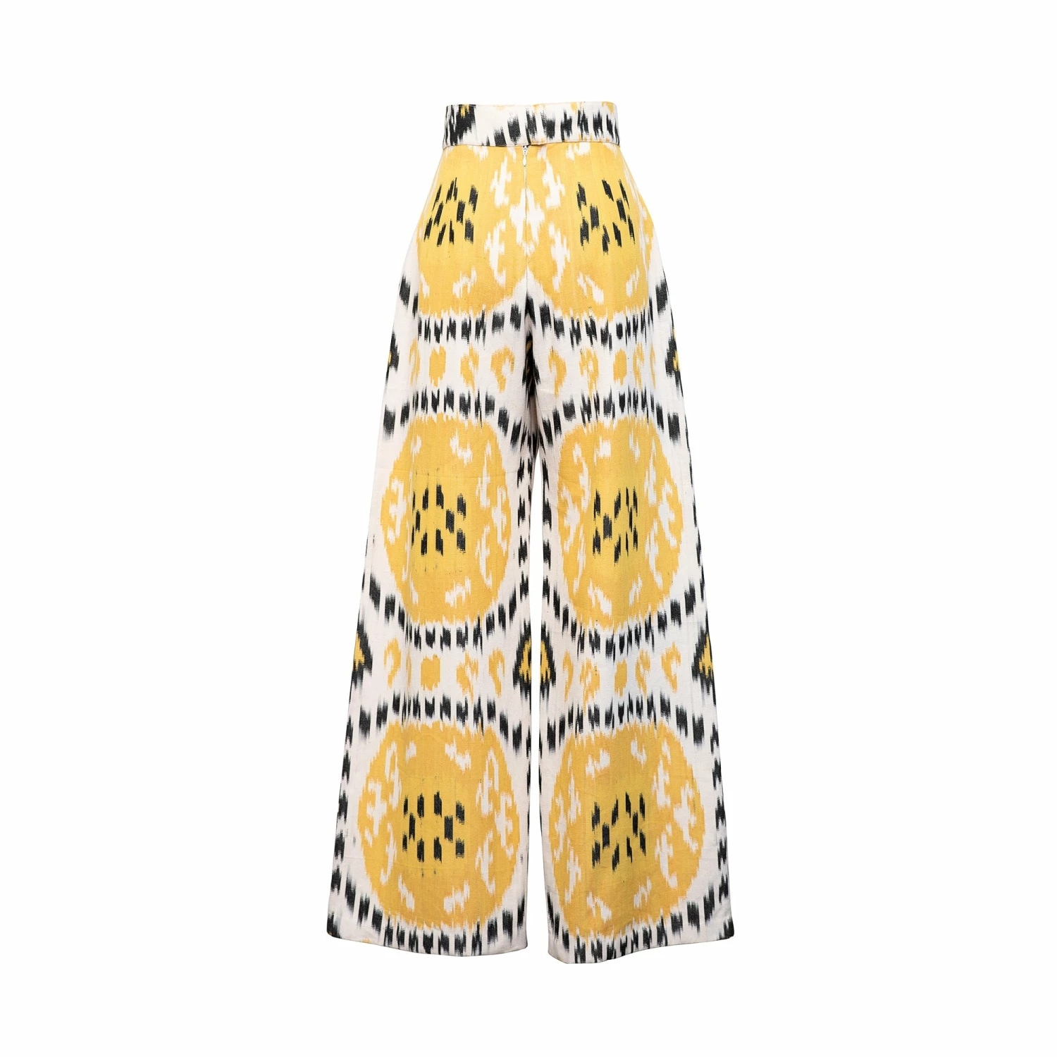These high waisted yellow trousers are made from handloom Ikat. The silhouette is slightly A shape, with back invisible zipper.